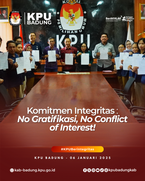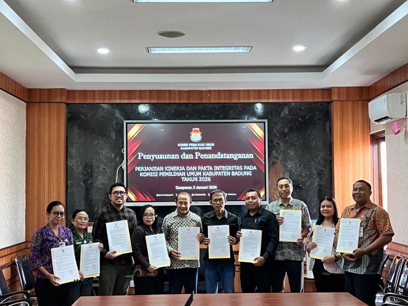 KPU Kabupaten Badung membuka tahun dengan langkah penting melalui Penyusunan dan Penandatanganan Perjanjian Kinerja serta Pakta Integritas Tahun 2026. Kegiatan ini jadi penanda awal komitmen bersama untuk menjalankan tugas secara profesional, transparan, dan penuh tanggung jawab sejak start awal tahun. Ketua KPU Kabupaten Badung menegaskan bahwa komitmen tersebut bukan sekadar formalitas. “Implementasi pakta integritas dan perjanjian kinerja KPU Kabupaten Badung menjadi pondasi utama agar setiap program dan keputusan yang diambil tetap on track, berintegritas, dan bisa dipertanggungjawabkan,”. Sejalan dengan itu, Sekretaris KPU Kabupaten Badung menekankan peran sekretariat dalam mendukung kerja kelembagaan. “Dalam konteks fasilitasi terkait kegiatan yang akan diselenggarakan, perjanjian kinerja menjadi acuan agar dukungan administrasi, anggaran, dan layanan berjalan efektif dan tepat sasaran,” jelasnya. Lewat penandatanganan ini, KPU Kabupaten Badung menunjukkan keseriusan untuk kerja lebih terukur, solid, dan berintegritas di Tahun 2026. Bukan cuma tanda tangan di atas kertas, tapi komitmen nyata untuk kerja bareng, kerja cerdas, dan kerja tuntas. Jumat, 2 Januari 2026, ....