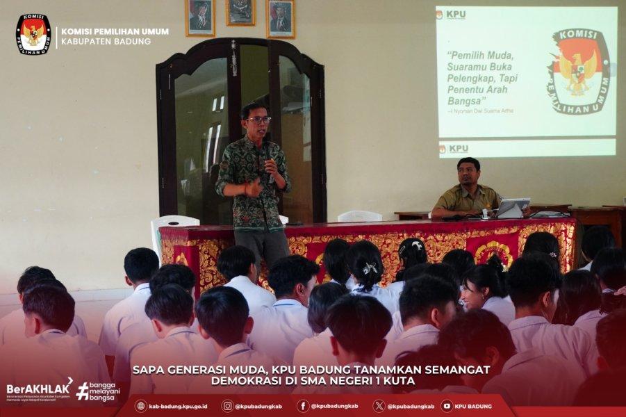 #TemanPemilih – KPU Badung Goes To School kembali hadir menyapa generasi muda! Kali ini kegiatan dilaksanakan di Aula SMA Negeri 1 Kuta, Senin (29/9/2025), Dengan menghadirkan perwakilan siswa kelas XI dan XII yang antusias mengikuti jalannya acara. Program ini menjadi salah satu upaya KPU Kabupaten Badung untuk mendekatkan pendidikan politik kepada pemilih pemula, sekaligus menumbuhkan kesadaran berdemokrasi sejak di bangku sekolah.