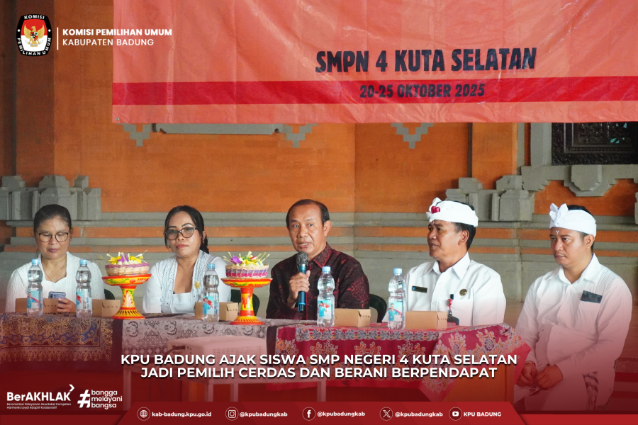 #TemanPemilih – Komisi Pemilihan Umum (KPU) Kabupaten Badung terus gencar melakukan pendidikan pemilih, kali ini menyasar pemilih pemula di lingkungan sekolah. Pada Selasa, 21 Oktober 2025, KPU Badung melaksanakan Sosialisasi Pendidikan Pemilih Pemula bertempat di Wantilan Kelurahan Benoa, Kuta Selatan, dengan peserta dari SMP Negeri 4 Kuta Selatan.