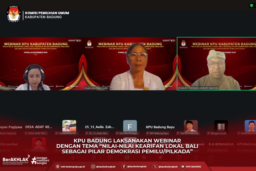 #TemanPemilih - Komisi Pemilihan Umum Kabupaten Badung menyelenggarakan webinar bertema “Nilai-Nilai Kearifan Lokal Bali sebagai Pilar Demokrasi Pemilu/Pilkada” pada Kamis, 5 November 2025 secara daring melalui Zoom Meeting.