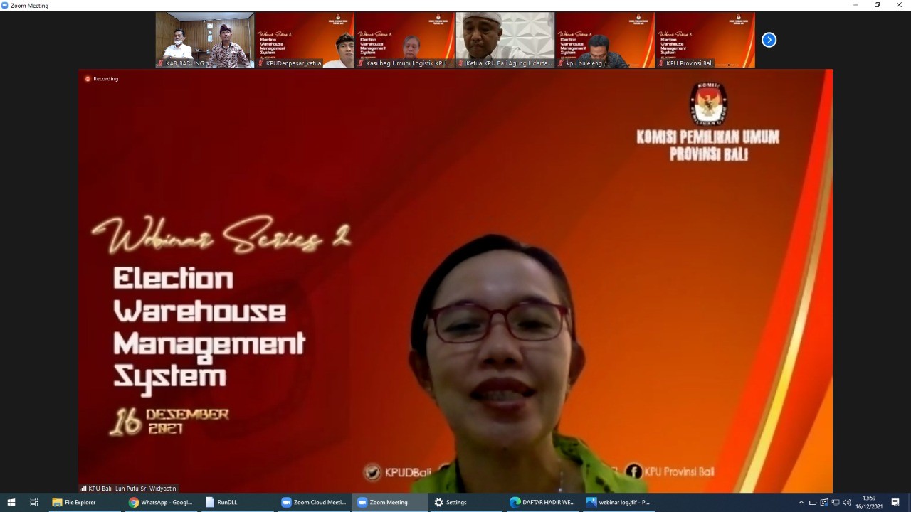Webinar kali ini bertema Manajemen Pengelolaan Gudang Logistik Pemilihan Serentak Tahun 2024 dengan pemateri Ketua KPU Provinsi Bali I Dewa Agung Gede Lidartawan. Pentingnya kesiapan gudang ini, ditunjukkan antara lain dengan ketepatan pemilihan gudang. Hal ini mengingat jumlah logistik nantinya yang cukup banyak.