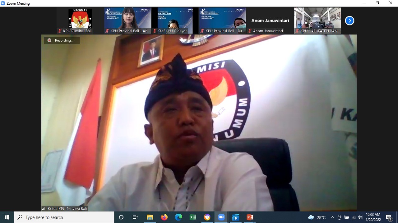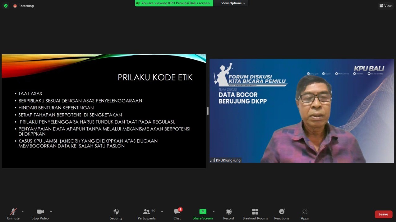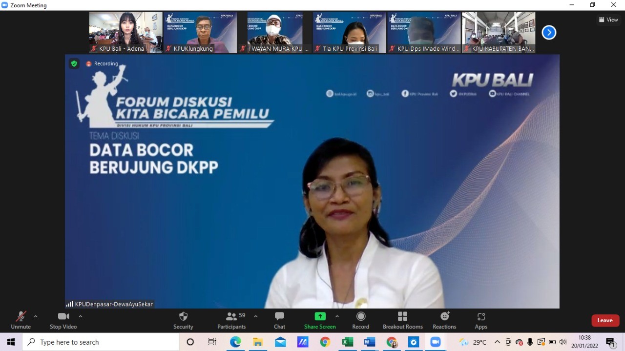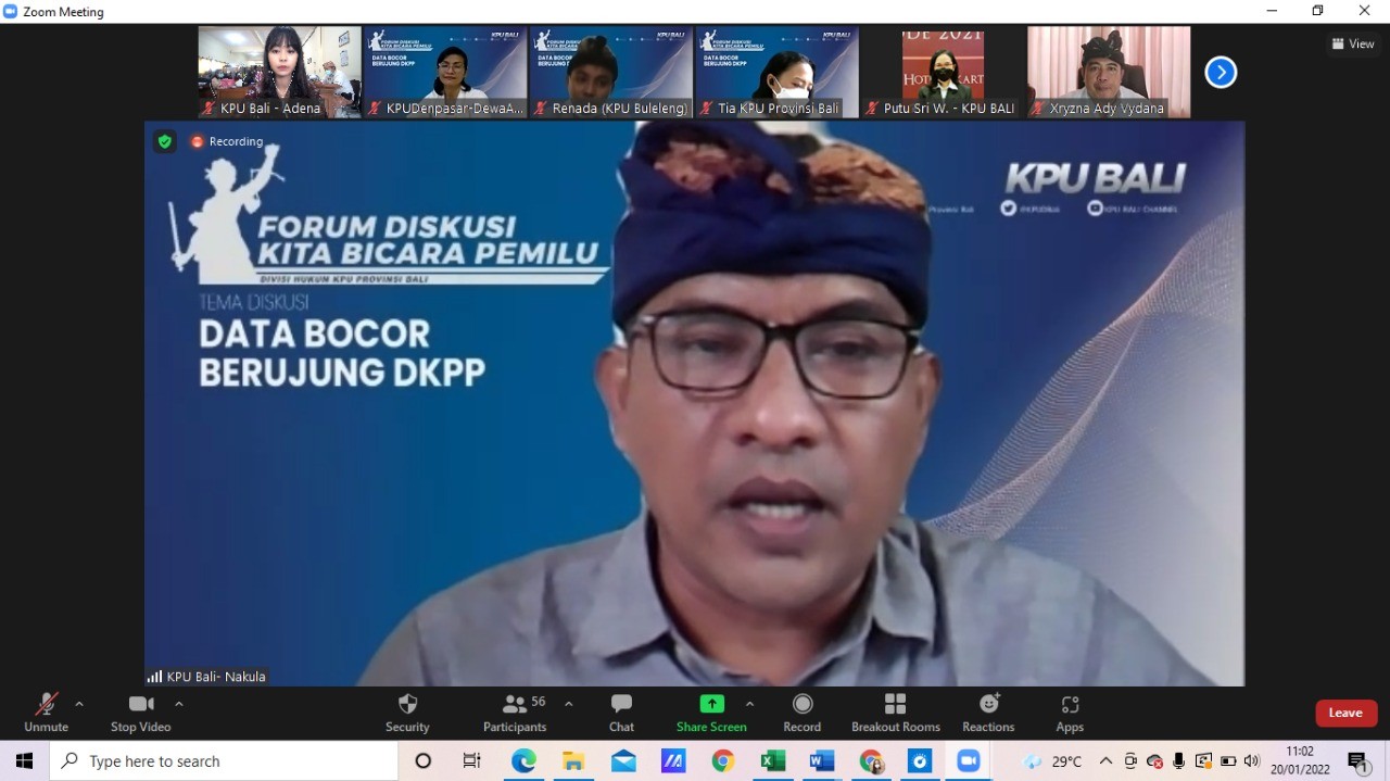 Mangupura, kab-badung.kpu.go.id - Forum Diskusi Kita Bicara Pemilu kali ini mengangkat tema “Data Bocor Berujung DKPP” yang diselenggarakan secara daring oleh KPU Provinsi Bali dalam rangka peningkatan kompetensi di bidang hukum, Kamis (20/01).
