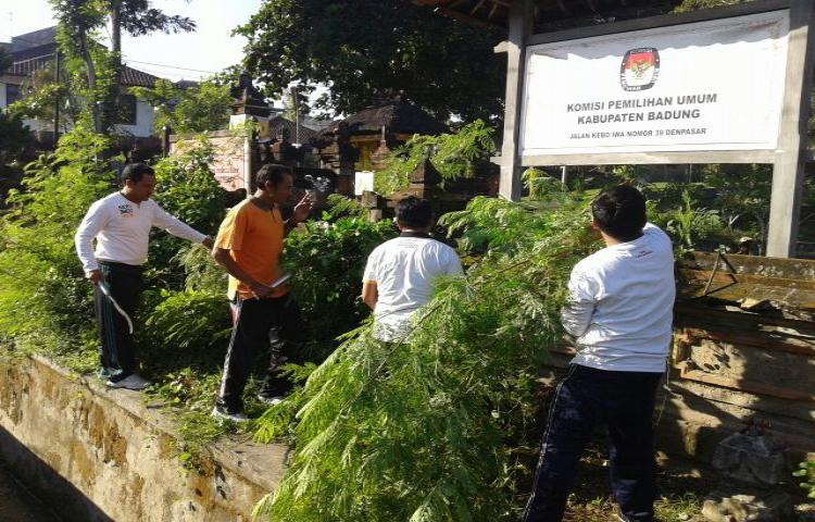 Mangupura-Dalam upaya menciptakan kebersihan lingkungan, pada Jumat, 3 Juni 2016 KPU Kabupaten Badung melaksanakan gotong-royong di halaman KPU Kabupaten Badung. Kegiatan rutin ini untuk menciptakan kantor yang bersih dan asri. "Akibat musim hujan banyaknya tumbuhan liar yang tumbuh bahkan menutupi tembok kantor oleh karena itu harus segera dilakukan pembersihan melalui kegiatan gotong-royong" Kata Ketua KPU Kab. Badung A.A. Gd. Raka Nakula di sela-sela kegiatan. "Kebersihan ini dilakukan secara bertahap mengingat luasnya halaman kantor dan akan dilakukan setiap hari jumat" lanjut Ketua KPU Kab. Badung A.A. Gd. Raka Nakula. Gotong-royong dilaksanakan oleh seluruh komisioner dan staf KPU Kab. Badung.