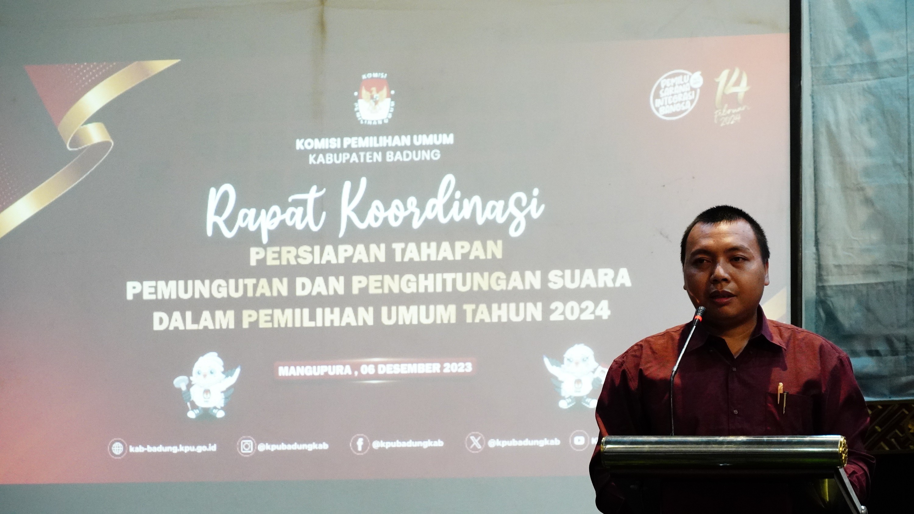KPU Badung – Dalam rangka Pemilu Serentak yang akan diselenggarakan pada hari Rabu tanggal 14 Februari 2024, KPU Kabupaten Badung mengadakan Rakor persiapan tahapan pemungutan dan penghitungan suara dalam Pemilu tahun 2024. Acara dimulai sekitar pukul 08.30 Wita, bertempat di Nirmala Hotel & Convention Center, Jalan Mahendradatta Nomor 81, Padangsambian, Denpasar Barat, Rabu (06/12/2023).