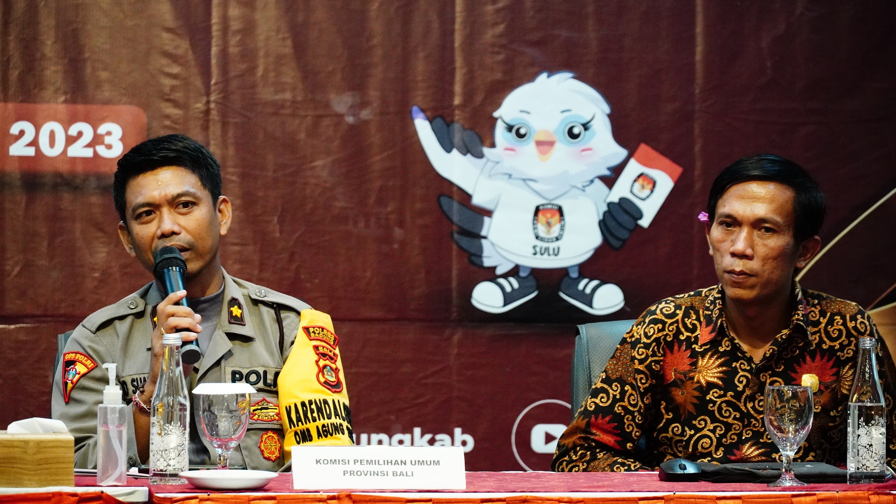 Wawasan mengenai kerawanan tahap pungut dan hitung suara, kerawanan tahap rekapitulasi penghitungan suara dan pengecekan logistik Pemilu disampaikan Narasumber dari Polres Badung. (Humas KPU Badung).