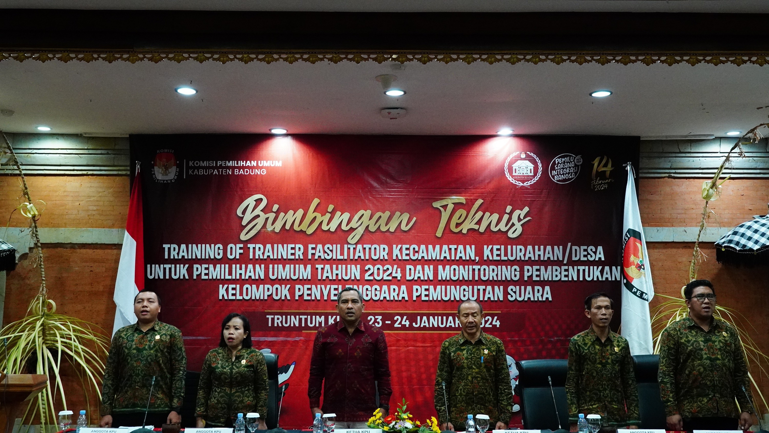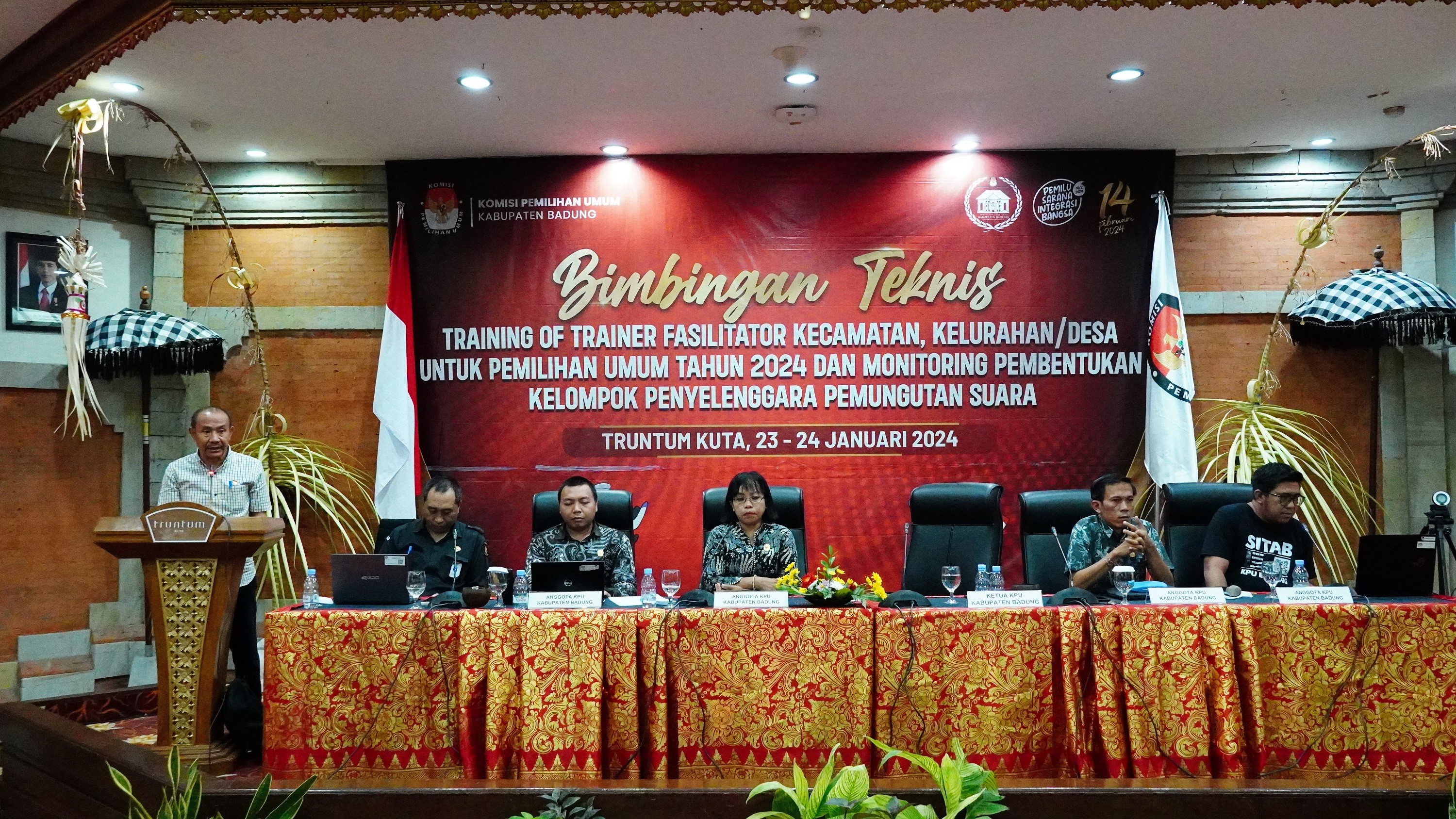 KPU Badung – Dalam rangka persiapan Bimbingan Teknis Kelompok Penyelenggara Pemungutan Suara (KPPS), KPU Kabupaten Badung melaksanakan Bimbingan Teknis (Bimtek) Training Of Trainer Fasilitator Kecamatan, Kelurahan/Desa untuk Pemilihan Umum Tahun 2024 dan Monitoring Pembentukan Kelompok Penyeienggara Pemungutan Suara (KPPS), bertempat di Truntum Kuta Formerly Grand Inna Kuta, Jl. Pantai Kuta No.1, Pande Mas, Kuta, Kec. Kuta-Badung. Selasa – Rabu (23- 24 /01/2024).