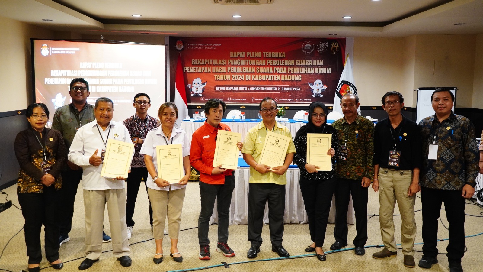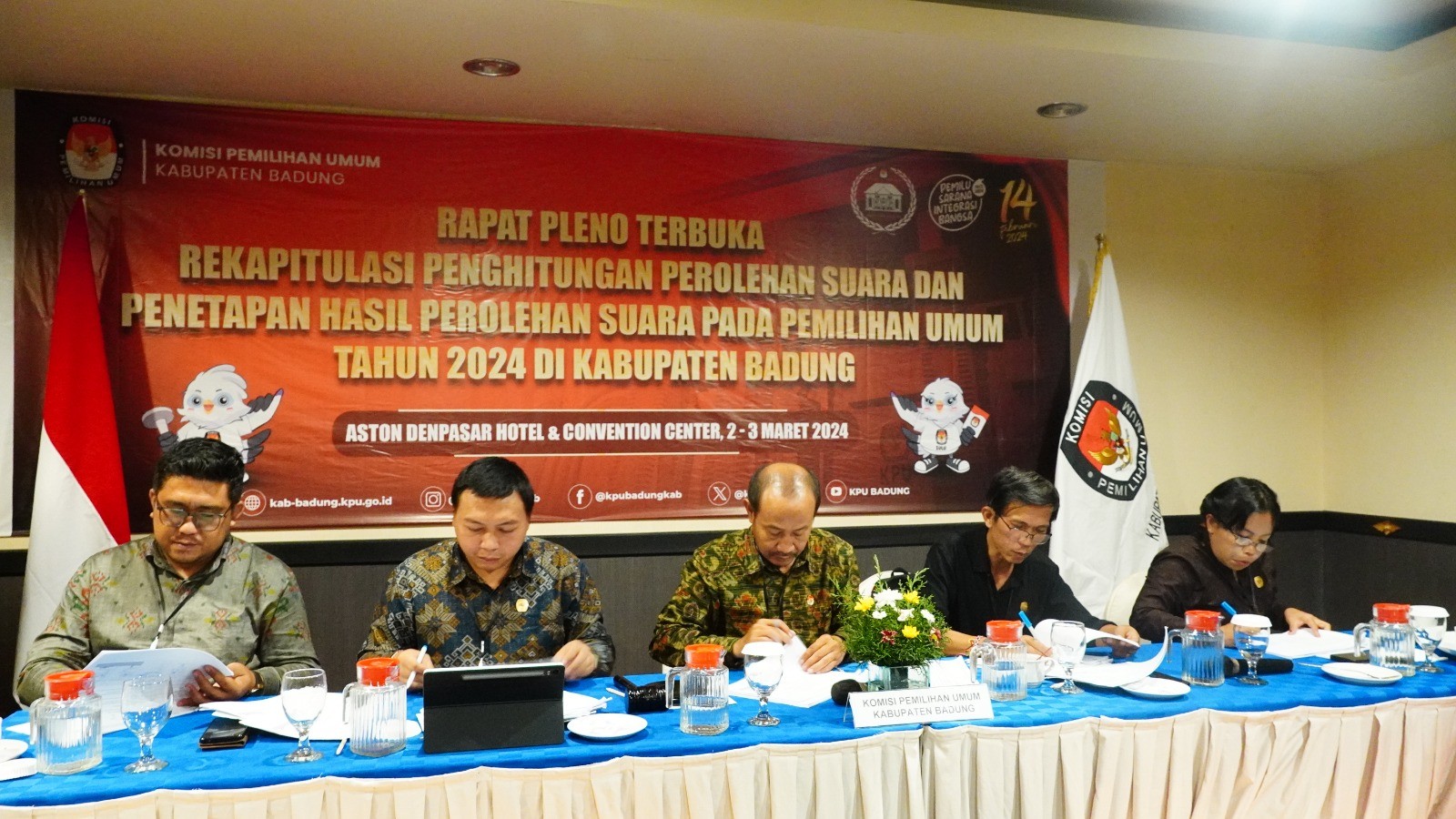 KPU Badung – Komisi Pemilihan Umum (KPU) Kabupaten Badung telah melaksanakan Rapat Rekapitulasi Hasil Penghitungan Perolehan suara dan Penetapan Hasil Perolehan Suara di Tingkat Kabupaten Badung Dalam Pemilu 2024 bertempat di Aston Denpasar Hotel & Convention Center, Jalan Gatot Subroto Barat, Nomor 283, Pemecutan Kaja, Denpasar pada Sabtu – Minggu (02-03/03/2024).