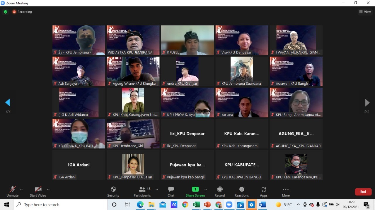 Mangupura - Pentingnya kesiapan KPU sebagai Penyelenggara Pemilu dan Pemilihan tahun 2024, KPU Provinsi Bali membuka Forum Diskusi Kita Bicara Pemilu dengan tema “Putusan DKPP 165 dan Implementasinya” Kamis (9/12/2021), dihadiri Anggota KPU Kabupaten/Kota serta Kasubbag Hukum se-Bali yang dilakukan secara daring.