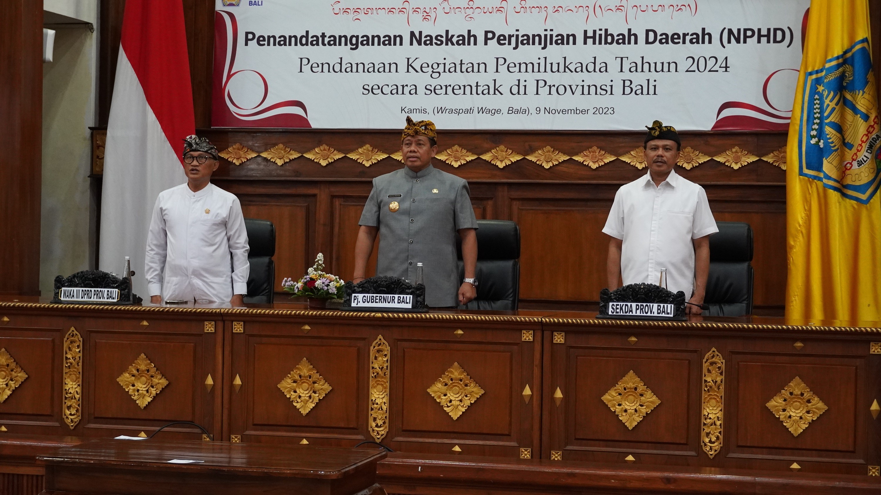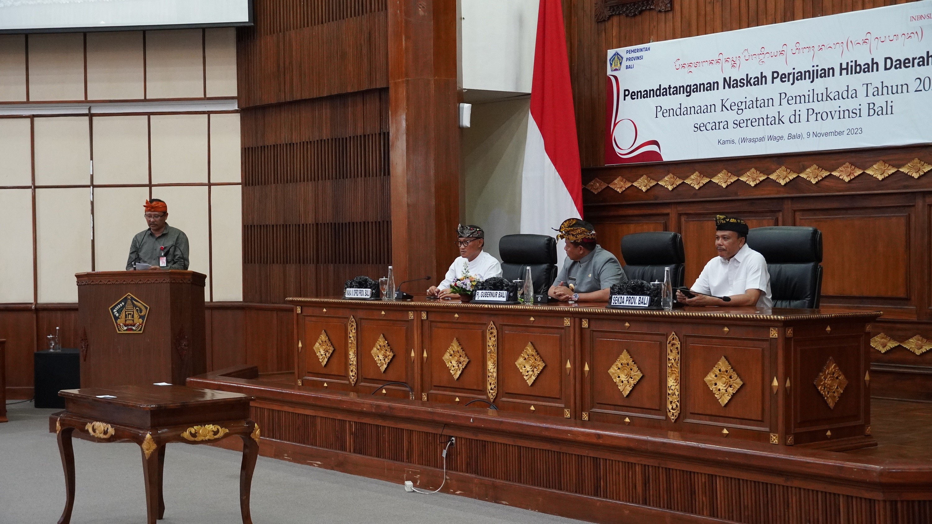 KPU Badung – Dalam rangka penandatanganan Naskah Perjanjian Hibah Daerah (NPHD) pendanaan kegiatan Pemilukada tahun 2024 secara Serentak di Provinsi Bali antara Gubernur, Bupati, Wali Kota dengan Ketua KPU, Ketua Bawaslu Provinsi dan Kabupaten/Kota Se – Provinsi Bali, maka dari KPU Kabupaten Badung hadir Ketua KPU Badung, I Gusti Ketut Gede Yusa Arsana Putra, bertempat di Wiswa Sabha Utama, Kantor Gubernur Bali Jl. Basuki Rahmat No. 1 Niti Mandala, Denpasar, sekitar pukul 14.00 Wita, Kamis (09/11/2023).