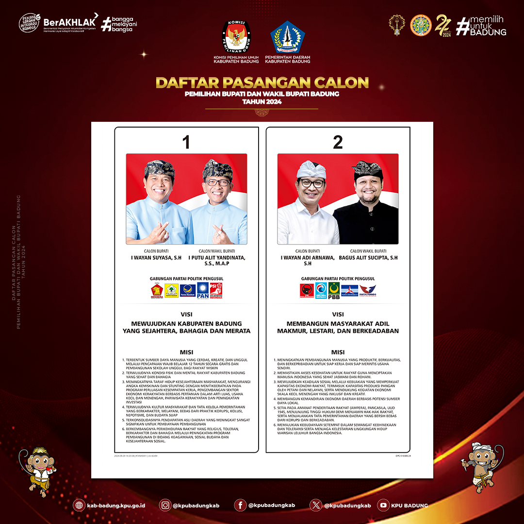Hai, #TemanPemilih Komisi Pemilihan Umum Kabupaten Badung mengumumkan Daftar Pasangan Calon Pemilihan Bupati dan Wakil Bupati Badung Tahun 2024.