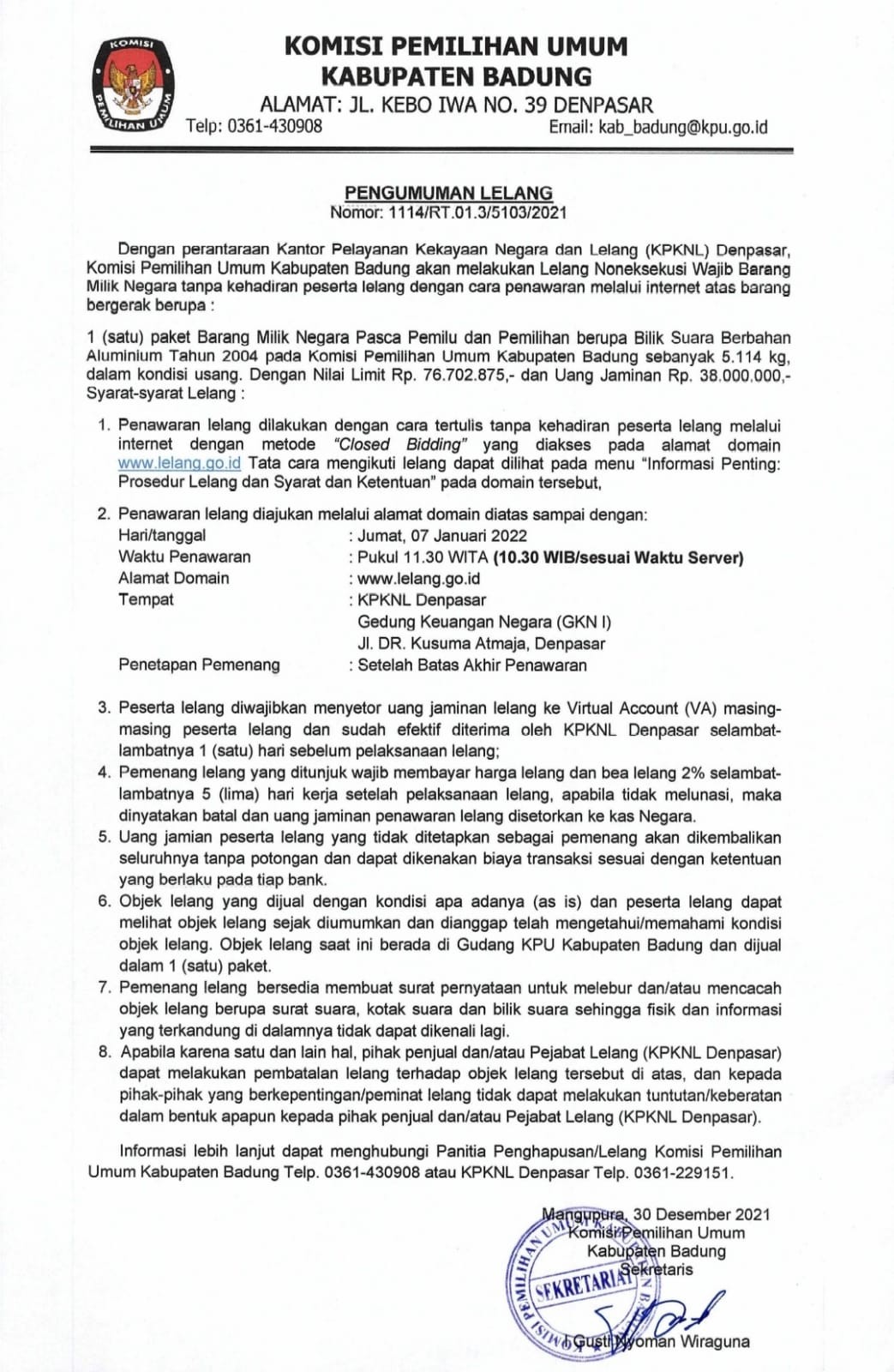 Dengan perantara Kantor Pelayanan Kekayaan Negara dan Lelang (KPKNL) Denpasar, KPU Kabupaten Badung akan melakukan Lelang Noneksekusi Wajib Barang Milik Negara tanpa kehadiran peserta lelang dengan cara penawaran melalui internet.
