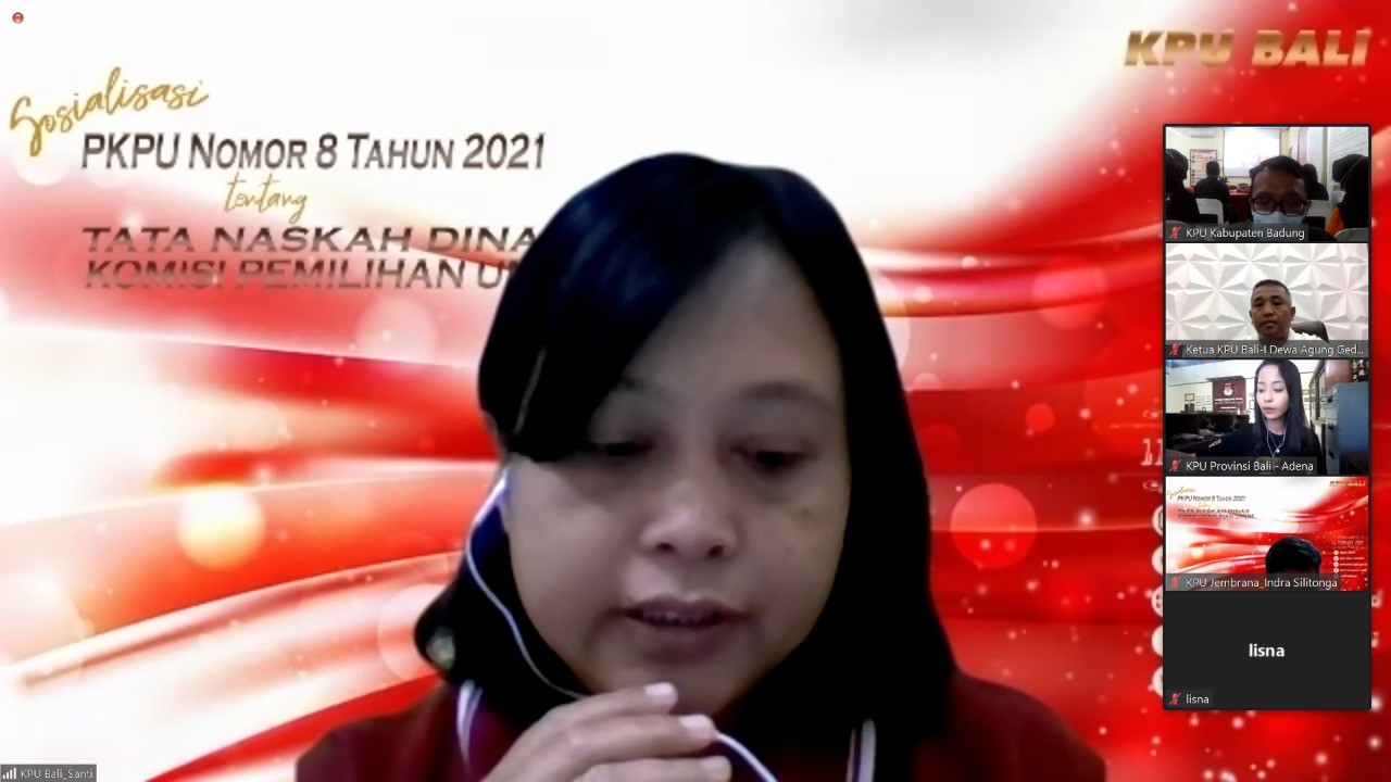 Mangupura, kab-badung.kpu.go.id - Untuk menciptakan kelancaran dan penyeragaman pemahaman dalam rangka komunikasi kedinasan secara tertulis yang efektif dan efisien dalam penyelenggaraan tertib administrasi, KPU Provinsi Bali menyelenggarakan Sosialiasasi Peraturan KPU Nomor 8 Tahun 2021 tentang Tata Naskah Dinas di Lingkungan KPU, Jumat (11/02) secara daring yang diikuti oleh KPU Kab/Kota se Bali.