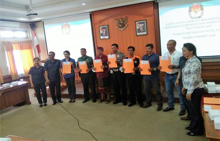 Meski berjalan berhimpitan dengan pelaksanaan Tahapan Pemilihan Gubernur dan Wakil Gubernur (PIlgub) Bali Tahun 2018 dengan tahapan Pemilihan Umum (Pemilu) Tahun 2019 yang masuk pada tahap akhir pembentukan Panitia Pemilihan Kecamatan (PPK) dan Panitia Pemungutan Suara (PPS) tetap harus terlaksana pada waktunya. Untuk itu, Komisi Pemilihan Umum (KPU) Kabupaten Badung melaksanakan acara Penetapan dan Pelantkan Anggota PPK dan PPS Pemilu Tahun 2019 bertempat di Hotel Nirmala, Jl. Mahendradatta Denpasar, Jumat (9/3/2018). Dengan memedomani petunjuk teknis yang ditetapkan KPU RI tentang mekanisme pembentukan badan adhoc dalam Pemilu tahun 2019, KPU Kabupaten Badung menempuh metode pengangkatan kembali (evaluasi) Anggota PPK dan PPS Pilgub Bali 2018 dengan melakukan evaluasi kinerja dan memperhatikan masa jabatan dua periode berturut-turut dari Anggota PPK dan PPS Pilgub Bali 2018 tersebut. Atas dasar hasil evaluasi tersebut, KPU Kabupaten Badung memilih dan menetapkan masing-masing 3 orang Anggota PPK untuk setiap kecamatan, dan 3 orang Anggota PPS untuk setiap desa/kelurahan di Kabupaten Badung, sehingga total Anggota PPK dan PPS yang dilantik berjumlah 204 orang. Dalam sambutannya, Ketua KPU Kabupaten Badung, Anak Agung Gede Raka Nakula mengatakan bahwa sangat berat hati memilih tiga dari lima orang Anggota PPK yang sedang bertugas dalam Pilgub Bali 2018 untuk ditetapkan menjadi Anggota PPK dalam Pemilu 2019. “Kami tekankan pentingnya integritas sebagai penyelenggara dan senantiasa menjaga netralitas dalam setiap perilaku dalam keseharian selama dalam pelaksanaan pemilu, agar tujuan kita yang sama dapat tercapai yakni suksesnya penyelenggaraan pemilihan umum tahun 2019,” kata Anak Agung Gede Raka Nakula. PPK dan PPS yang dilantik juga melakukan penandatanganan Pakta Integritas yang isinya antara lain Menjaga Indenpendensi dan Integritas, sebagai Penyelenggara Pemilihan Umum tahun 2019, Bersikap transparan,Jujur, Adil, Obyektif, dan Akuntabel dalam melaksanakan tugas, Bekerja secara sungguh-sungguh dengan cermat dan penuh kehatia-hatian, Memberikan Informasi yang seluas-luasnya kepada masyarakat, pemilih, maupun peserta Pemilihan Umum Tahun 2019, Melaksanakan tugas dan tanggung jawab sebagai penyelenggara Pemilihan Umum Tahun 2019 sesuai dengan Peraturan, Perundang-undangan yang berlaku. Untuk masa tungas Anggota PPK dan PPS yang dilantik ini sampai dengan dilaksanakannya putaran kedua pada pelaksanaan Pemilihan Presiden dan Wakil Presiden Tahun 2019. Hadir dalam acara ini adalah perwakilan dari Polres Badung, Polresta Denpasar, Dandim 1611 Badung, Kesbangpol Kabupaten Badung, Ketua Pengadilan Negeri Denpasar, Kepala Kejaksaan Negeri Denpasar, Kepala Badan Kesbangpol Kabupaten Badung, Kepala Dinas Kependudukan dan Catatan Sipil Kabupaten Badung, Kasat Pol PP dan Limas Kabupaten Badung, Ketua Panwaslu Kabupaten Badung dan Camat se Kabupaten Badung. FOTO KEGIATAN: PPK dan PPS Pemilu 2019 bersiap mengikuti prosesi pelantikan Penandatangan Pakta Integritas oleh perwakilan PPK dan PPS Sambutan Kepala Badan Kesbangpol Kab. Badung, I Nyoman Suendi