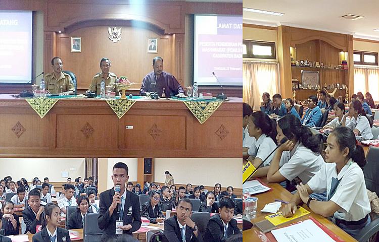 Mangupura- Dalam rangka meningkatkan partisipasi pemilih, KPU Kabupaten Badung dengan gencar memberika sosialisasi bagi pemilih pemula. Salah satunya melalui kegiatan yang menyasar perwakilan SMA se-Kabupaten Badung, bertempat di Kantor Badan Kesbangpol Kabupaten Badung (27/2/2018) Bekerja sama dengan Kesbangpol Badung, acara ini dibuka oleh Kepala Badan Kesbangpol Badung I Ketut Suendi. Dalam sambutannya, I Nyoman Suendi menekankan tentang pentingnya Pendidikan politik bagi generasi muda, guna meningkatkan pemahaman dan partisipasi politik terutama bagi pemilih pemula. Peningkatan pemahaman dan partisipasi politik dipaparkan lebih lanjut dalam materi yang disampaikan Komisioner KPU Kabupaten Badung I Wayan Artana Dana. Mengambil tema ‘Generasi Muda Cerdas Berdemokrasi”, Artana Dana memaparkan diantaranya tentang syarat-syarat pemilih, pelaksana pemilu, tahapan pemilu, serta pelaksanaan Pilgub Bali 2018 dan Pileg 2019 mendatang. Lebih lanjut dijelaskan, proses menjelang pelaksanaan pemilihan, dimulai dengan pendataan pemilih dalam DPT hingga panggilan untuk datang ke TPS pada hari libur atau hari yang diliburkan. Bagi pemilih disabilitas, telah difasilitasi dengan penyediaan template bagi tunanetra dan pendampingan bagi disabilitas. Terkait pelaksanaan Pilgub Bali pada 27 Juni 2018, disampaikan pula distribusi logistik alat kelengkapan pemungutan suara. Pada H-1 hari pemilihan, logistic harus sudah sampai di PPS melalui PPK untuk dapat didistribusikan langsung ke TPS. Setelah dibuka pada pukul 07.00 WITA, maka proses perhitungan suara akan dimulai pada pukul 13.00 WITA. Karena itu, diharapkan para peserta sosialisasi dari siswa siswi SMA se-Kabupaten Badung untuk datang ke TPS dan menggunakan hak pilih sebagai bagian dari partisipasi politik.