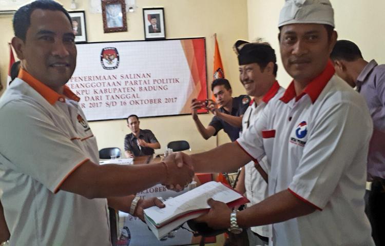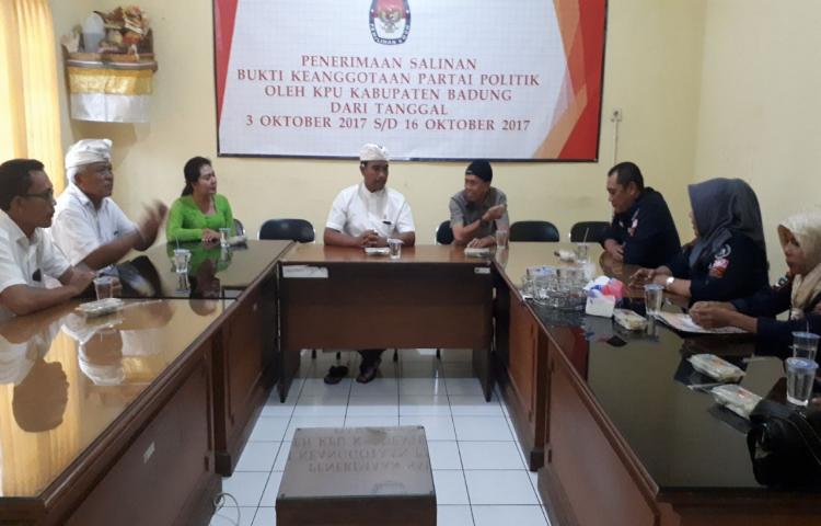 Mangupura- Memasuki hari ke tujuh pelaksanaan pendaftaran partai politik peserta pemilu 2019 pada Senin (9/10/2017), Partai Persatuan Indonesia (Perindo) menjadi partai yang pertama kali melakukan pendaftaran ke KPU Kabupaten Badung. Dalam proses pendaftaran ini, partai politik harus menyerahkan jumlah minimal keanggotaan yang dibuktikan dengan salinan KTP elektronik dan kartu tanda anggota (KTA). Ketua KPU Kabupaten Badung Anak Agung Gede Raka Nakula saat menerima langsung jajaran Partai Perindo, menyambut baik kesiapan partai yang melakukan pendaftaran secara serentak seluruh Indonesia ini. Sementara itu, Komisioner KPU Kabupaten Badung I Wayan Semara Cipta menegaskan kembali proses mekanisme penerimaan pendaftaran sesuai standar operasional prosedur (SOP). KPU Kabupaten Badung akan menerima berkas yang diserahkan partai politik, kemudian melakukan penghitungan jumlah keanggotaan, sesuai dengan daftar nama dalam lampiran yang dicetak dari aplikasi Sistem Informasi Partai Politik (SIPOL) untuk pengguna partai politik. Setelah dilakukan penerimaan dan pencermatan terhadap jumlah keanggotaan Partai Perindo, masih ditemukan kekurangan jumlah salinan KTP elektronik dan KTA. Terhadap kekurangan ini, pihak partai akan melakukan perbaikan sebelum batas waktu pendaftaran berakhir. Selain itu, Partai Perindo juga akan melakukan perbaikan susunan salinan keanggotaan sehingga akan memudahkan petugas dalam melakukan verifikasi administrasi dan factual nantinya. Agung Nakula selaku Ketua KPU Badung menegaskan bahwa masa pendaftaran partai politik hingga 16 Oktober 2017, sehingga masih ada kesempatan bagi partai politik yang berkasnya belum lengkap.