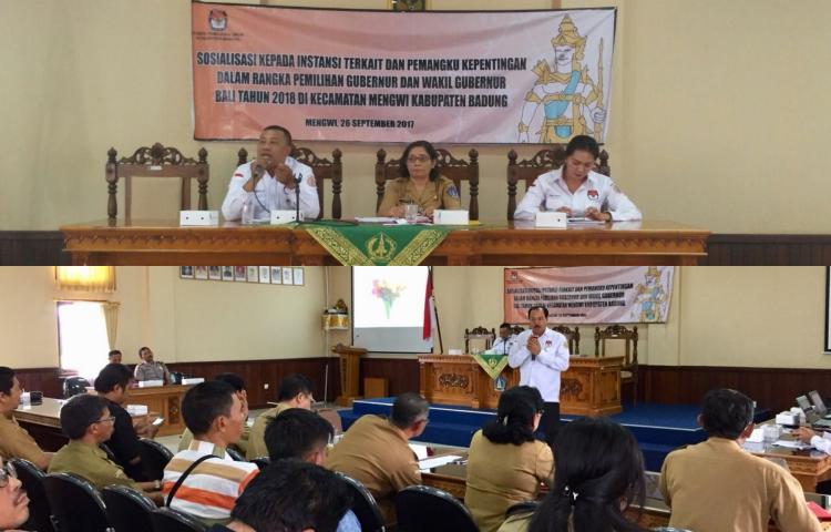 Mangupura- Memasuki tahapan Pemilihan Gubernur dan Wakil Gubernur Bali Tahun 2018 mendatang, KPU Kabupaten Badung semakin memantapkan kegiatan sosialisasi,salah satunya kepada instansi terkait dan pemangku kepentingan di setiap kecamatan di Kabupaten Badung. Sosialisasi diawali di Kecamatan Mengwi sebagai kecamatan dengan jumlah desa terbanyak, bertepatan pada Selasa (26/9/2017).