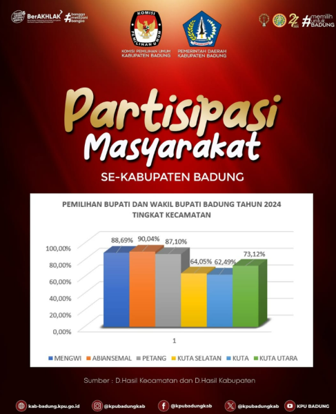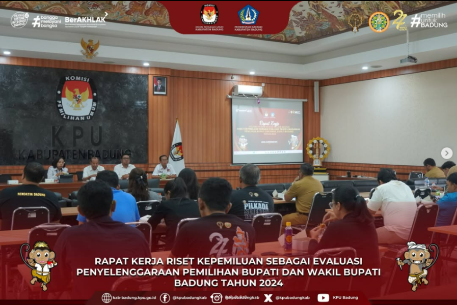 #TemanPemilih - Komisi Pemilihan Umum Kabupaten Badung mengadakan rapat kerja riset kepemiluan sebagai evaluasi penyelenggaraan pemilihan Bupati dan Wakil Bupati Badung Tahun 2024 Senin, 16 Desember 2024. Kegiatan ini dibuka oleh Ketua KPU Kabupaten Badung I.G.K.G Yusa Arsana Putra, dalam sambutannya menyampaikan "evaluasi partisipasi masyarakat dan perbaikan teknis pilkada adalah langkah strategis demi demokrasi yang lebih inklusif dan berkualitas", ujarnya. Evaluasi partisipasi masyarakat dalam Pilkada menjadi langkah penting untuk meningkatkan kualitas demokrasi di masa mendatang. Dengan memperhatikan tantangan seperti rendahnya kehadiran di TPS dan perlunya sosialisasi yang lebih efektif, kita dapat menyusun strategi yang lebih baik untuk memastikan setiap warga memiliki kesempatan berpartisipasi secara optimal. Koordinasi yang solid, manajemen waktu yang efektif, serta perbaikan tata tertib akan menjadi kunci sukses penyelenggaraan Pilkada yang lebih inklusif dan berkualitas. Mari bersama-sama wujudkan demokrasi yang lebih baik melalui langkah nyata dan kerja keras yang berkesinambungan. Dalam kesempatan ini, hadir pula kepala dinas komunikasi dan informasi kabupaten Badung, badan kesatuan Bangsa dan politik, dan panitia pemilihan kecamatan se-kabupaten Badung. @kpu_ri @kpu_bali #KPUMelayani #KPUBadung #HumasKPUBadung #MemilihUntukBadung #PilkadaSerentak2024