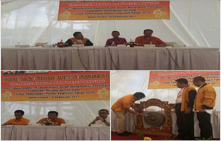 Dalam acara yang dibuka secara resmi oleh Ketua DPD Partai Hanura Bali I Made Sudarta, juga menghadirkan Kepala Kesbangpol Kabupaten Badung sebagai narasumber dengan materi penyampaian secara umum tentang fasilitas pemerintah kepada partai politik baik berupa bantuan maupun peningkatan wawasan dalam kepemiluan. Selain itu, kegiatan dihadiri pula oleh Anggota DPD Bali Kadek Arimbawa, Wakil Ketua DPP Partai Hanura Pasek Swardika, dan jajaran pengurus Partai Hanura di tingkat kabupaten dan kecamatan.