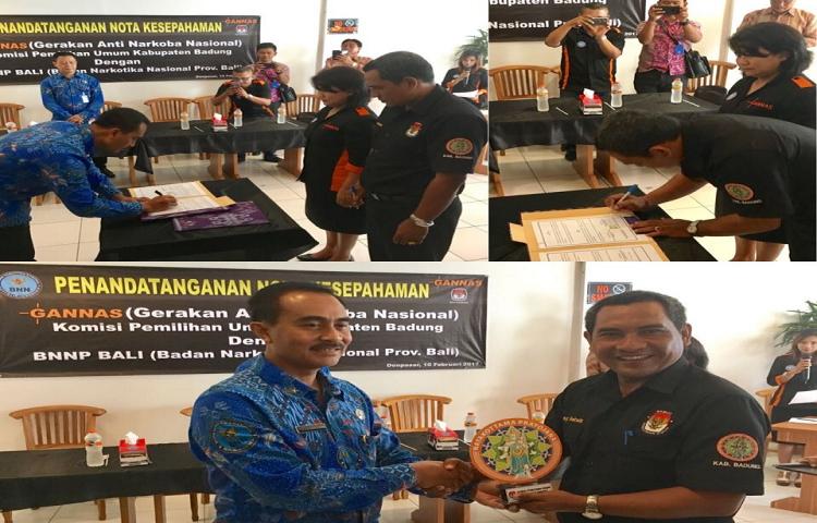 Mangupura- Komisi Pemilihan Umum (KPU) Kabupaten Badung dan Badan Narkotika Nasional Provinsi Bali (BNNP Bali) menjalin kerjasama dalam bidang Pencegahan dan Pemberantasan Penyalahgunaan dan Peredaran Gelap Narkotika (P4GN) yang dituangkan dalam bentuk Nota Kesepahaman/MoU (Memorandum of Understanding). Penandatanganan kerjasama tersebut dilakukan oleh Ketua KPU Badung Anak Agung Gede Raka Nakula, SH,MH dan Ketua BNNP Bali Brigadir Jendral Polisi Drs. I Putu Gede Suastawa, SH di Denpasar pada Jumat (10/2/2017). Raka Nakula dalam sambutannya menyampaikan bahwa penandatanganan kerjasama ini mempunyai tujuan utama untuk melaksanakan pencegahan dan pemberantasan penyalahgunaan dan peredaran gelap narkotika, serta prekusor narkotika di kalangan generasi muda dan masyarakat umum. Selain itu, untuk menciptakan pemilih cerdas bebas narkoba dan mampu melahirkan pemimpin yang berintegritas melalui pemilu. Ditambahkan pula, para peserta dalam pelaksanaan pemilu harus menyertakan dokumen bebas penyalahgunaan narkotika dari BNN. Sehingga, sudah menjadi tugas semua pihak untuk membentengi negara dari narkoba. “Ini merupakan salah satu sinergi dan saling percaya antara dua institusi yang diberi tugas oleh negara", ujarnya. Turut hadir dalam acara penandatanganan MoU tersebut Anggota KPU Kabupaten Badung, Sekretaris, Kasubag Teknis dan Hupmas, Kasubag Hukum serta staf Sekretariat KPU Kabupaten Badung.