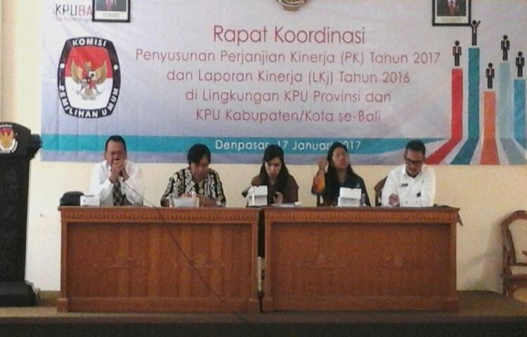 Dalam rapat koordinasi tersebut, Sekretaris KPU Provinsi Bali menjelaskan keharusan penyusunan Laporan Kinerja dan Perjanjian Kinerja oleh Sekretariat dan Komisioner sesuai SE 698/KPU/XII/2016 Perihal Penyampaian Perjanjian Kinerja Tahun 2017 dan Laporan Kinerja Tahun 2016. Hal yang ditekankan bagi komisioner adalah laporan kinerja sesuai dengan divisi masing-masing, yang lebih banyak menyangkut kebijakan dibandingkan dengan laporan sekretariat yang memuat angka-angka.