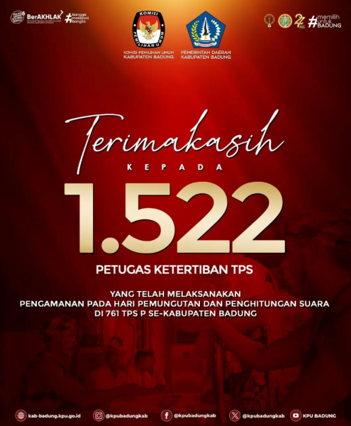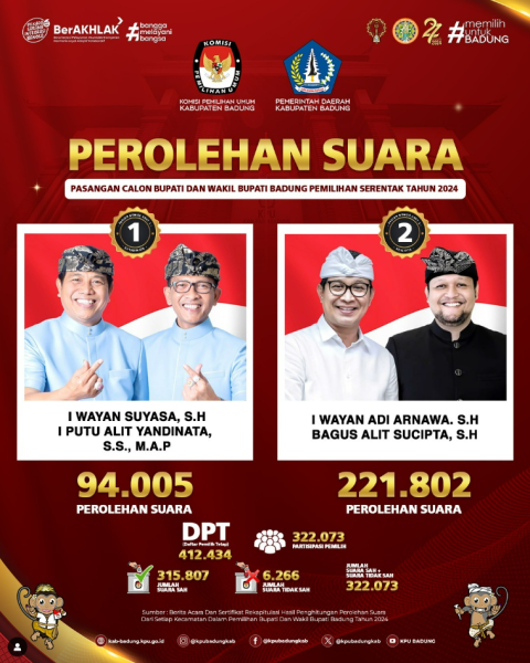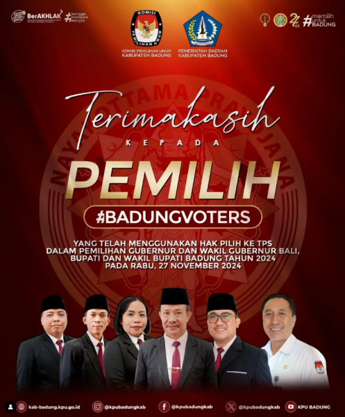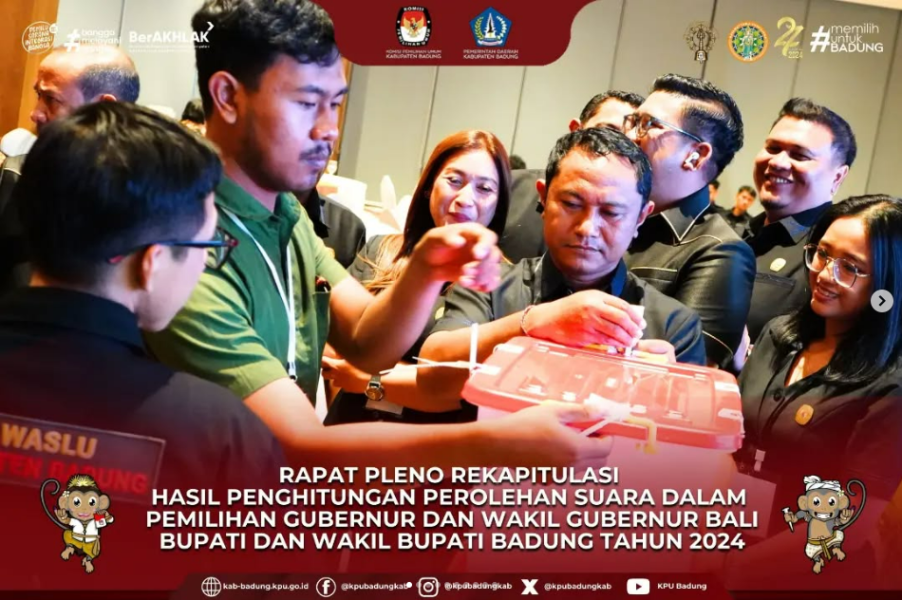 #TemanPemilih - Komisi Pemilihan Umum Kabupaten Badung telah melaksanakan Rapat Pleno Rekapitulasi Hasil Penghitungan Perolehan Suaea dalam Pemilihan Gubernur dan Wakil Gubernur Bali serta Bupati dan Wakil Bupati Badung Tahun 2024 pada Rabu, 4 Desember Tahun 2024.