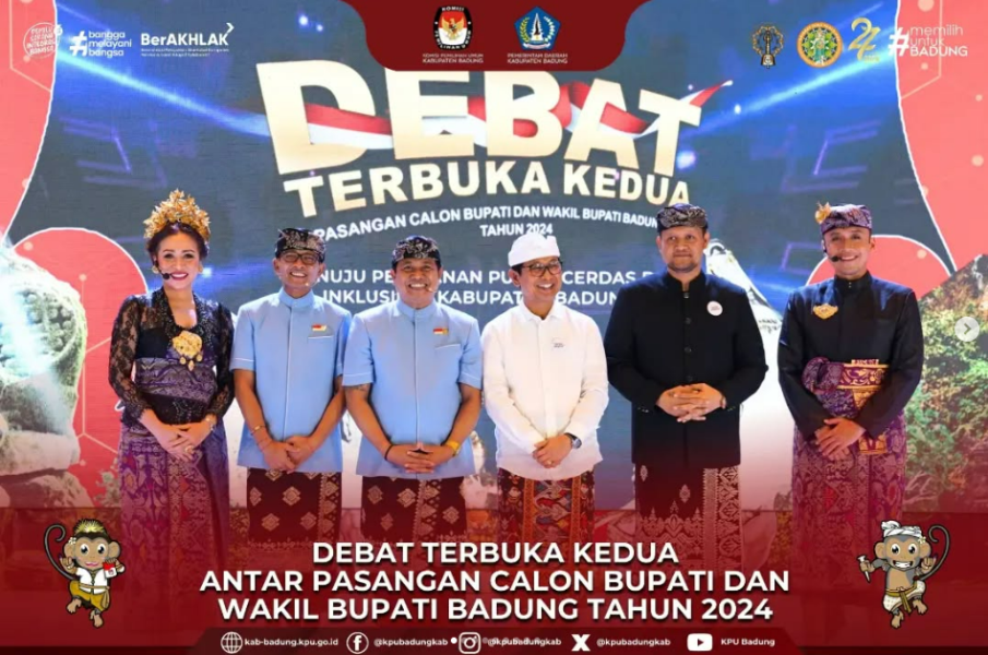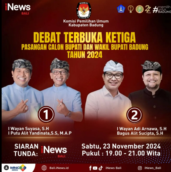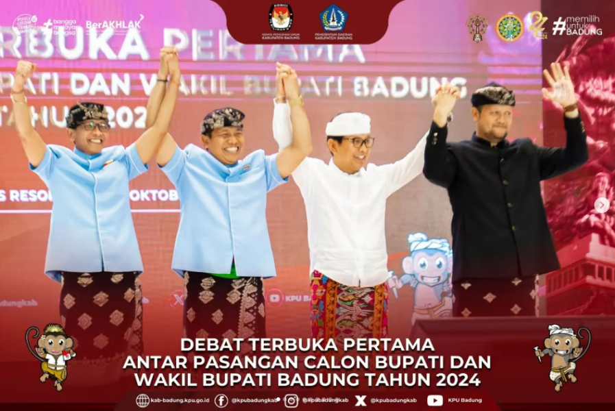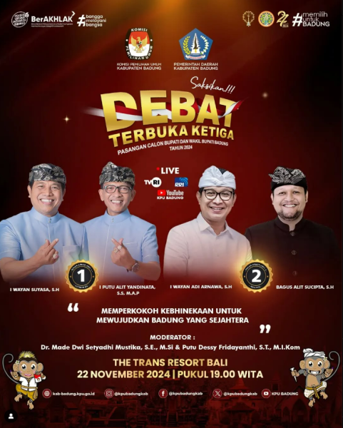 #TemanPemilih - Komisi Pemilihan Umum – KPU Kabupaten Badung gelar debat terbuka pertama antar pasangan calon Bupati dan Wakil Bupati Badung Tahun 2024. Kedua pasangan calon Bupati dan Wakil Bupati Badung I Wayan Suyasa – I Putu Alit Yandinata (Suyadinata) dan I Wayan Adi Arnawa – Bagus Alit Sucipta (Adicipta) akan mengikuti debat terbuka sebanyak tiga kali. Debat pertama yang digelar 25 Oktober 2024, mengangkat tema "Menuju Pemerataan dan Keselarasan Pembangunan, Pariwisata, Seni, Adat, dan Budaya serta Lingkungan di Kabupaten Badung"