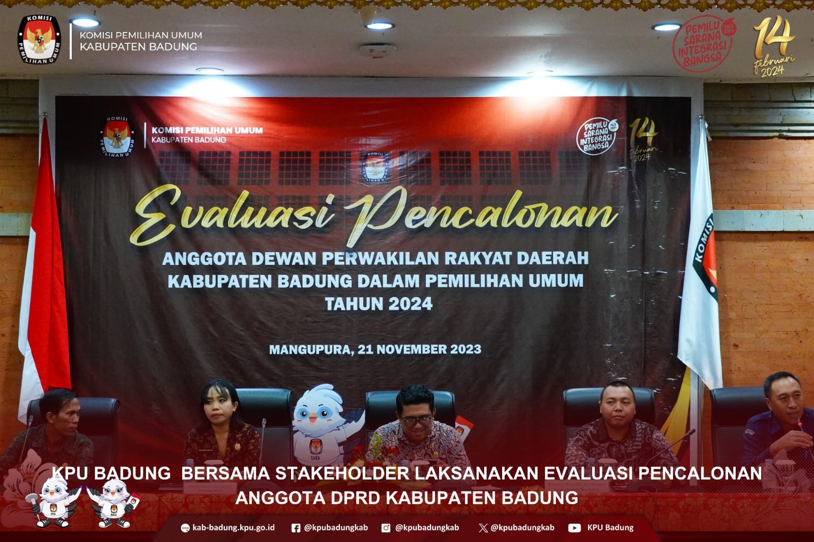 KPU Badung – Dalam rangka tahapan Pemilu Serentak yang akan dilaksanakan pada Rabu, 14 Februari 2024, KPU Kabupaten Badung melaksanakan “Evaluasi Pencalonan Anggota DPRD Kabupaten Badung, bertempat di Truntum Kuta Formerly Grand Inna Kuta, Selasa (21/11/2023)