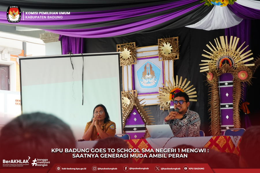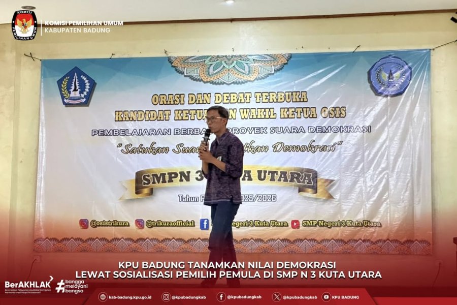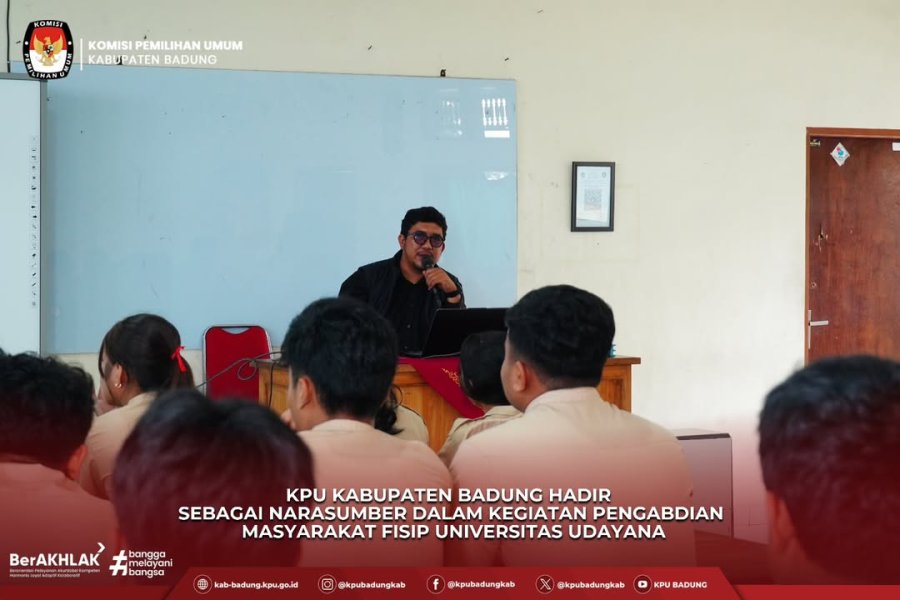 #TemanPemilih - Komisi Pemilihan Umum (KPU) Kabupaten Badung melalui Anggotanya, Agung Rio Swandisara, hadir sebagai narasumber dalam kegiatan Pengabdian Masyarakat yang diselenggarakan oleh Fakultas Ilmu Sosial dan Ilmu Politik Universitas Udayana pada Jumat, 19 September 2025, bertempat di Laboratorium Fisika SMAN 1 Abiansemal.
