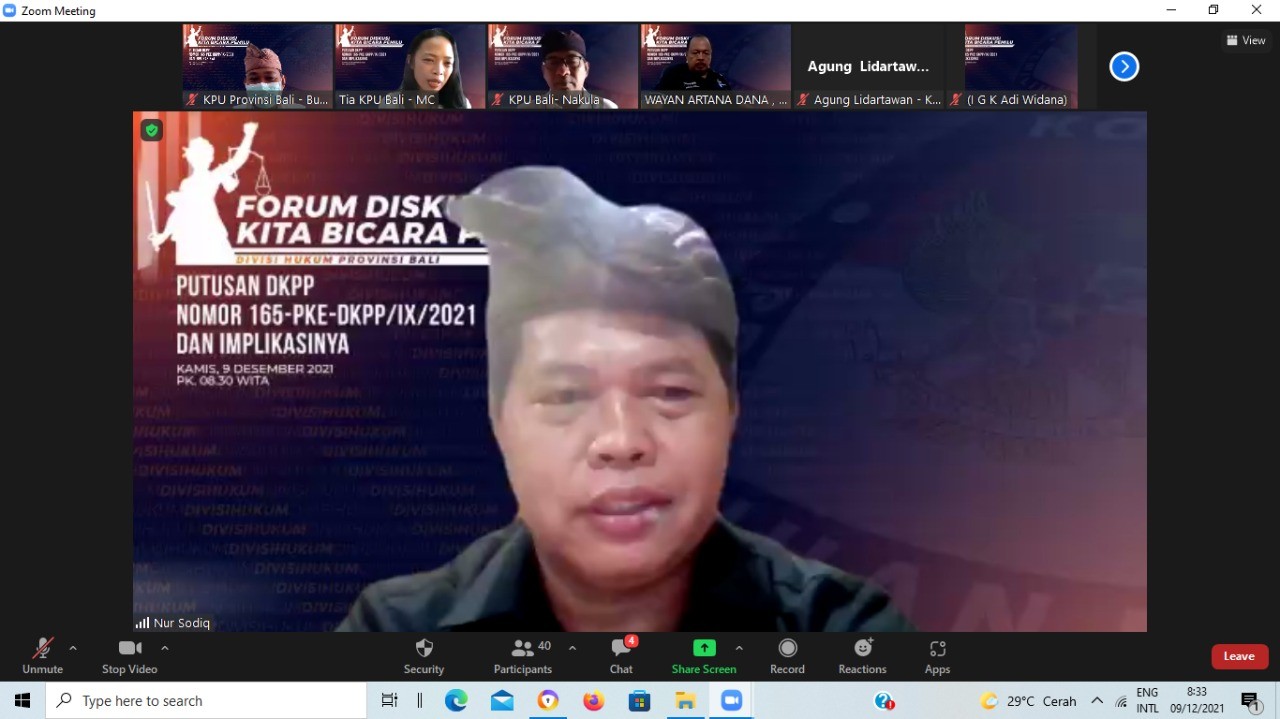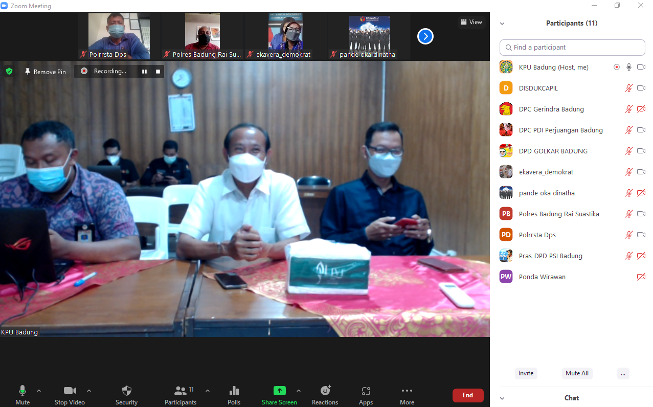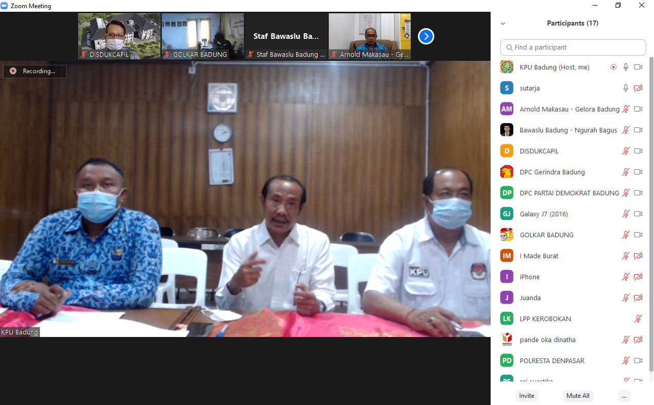 Pada kesempatan ini dari KPU Kabupaten Badung hadir mengikuti seminar Komisioner Divisi Hukum dan Pengawasan, Nur Sodiq, Divisi Sosialisasi, Pendidikan Pemilih, Parmas dan SDM, I Wayan Artana Dana, serta hadir secara daring Kasubag Hukum Ni Made Irawati.