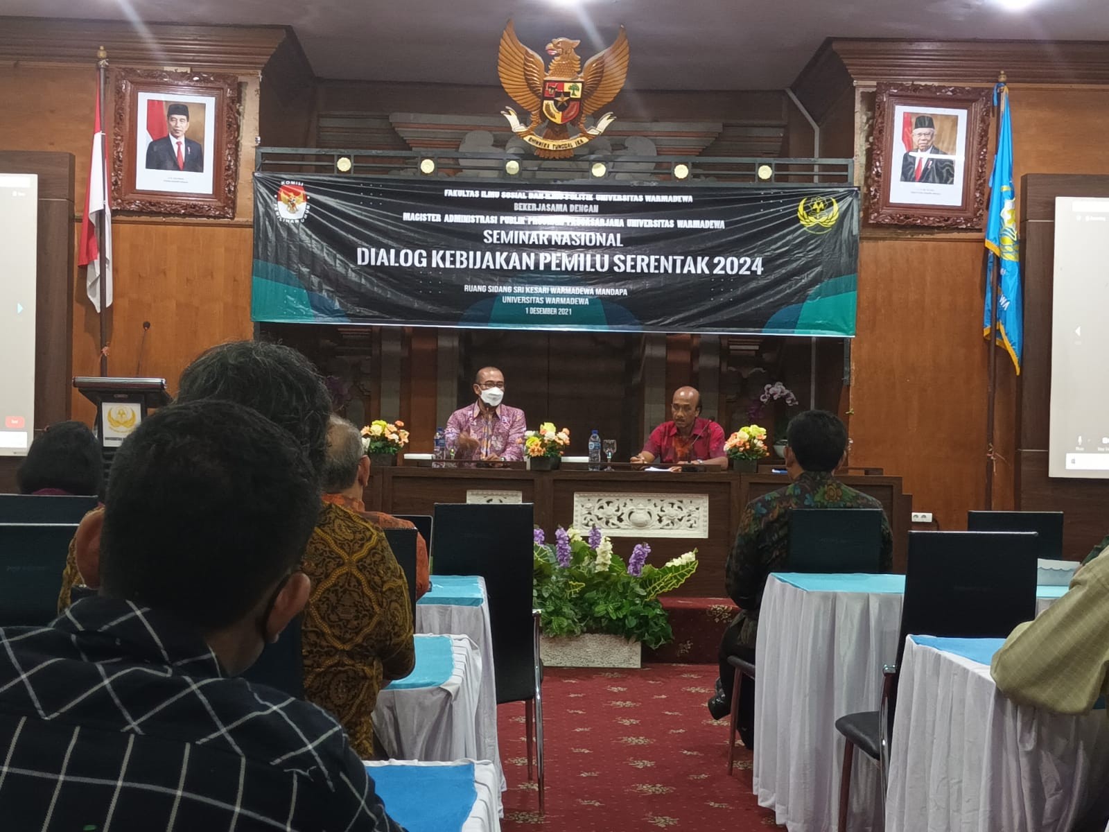 Berkaitan dengan hal tersebut, Fakultas Ilmu Sosial dan Ilmu Politik bekerja sama dengan Magister Ilmu Administrasi Publik Universitas Warmadewa menyelenggarakan Seminar Nasional dengan tema "Dialog Kebijakan Pemilu Serentak Tahun 2024" Selasa (01/12/2021).