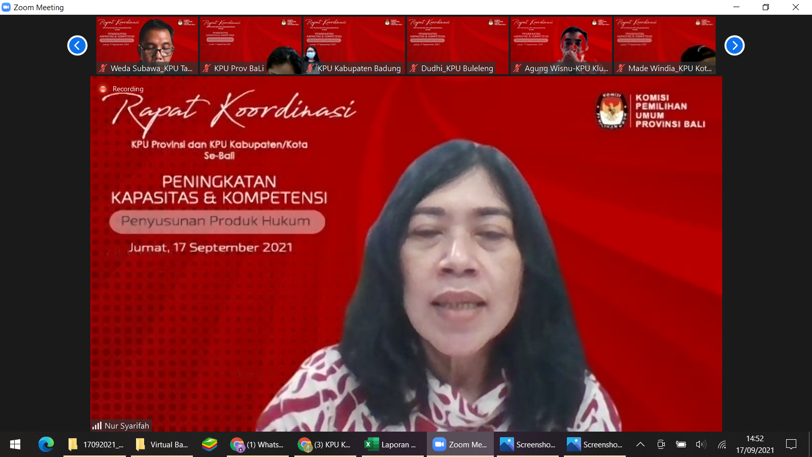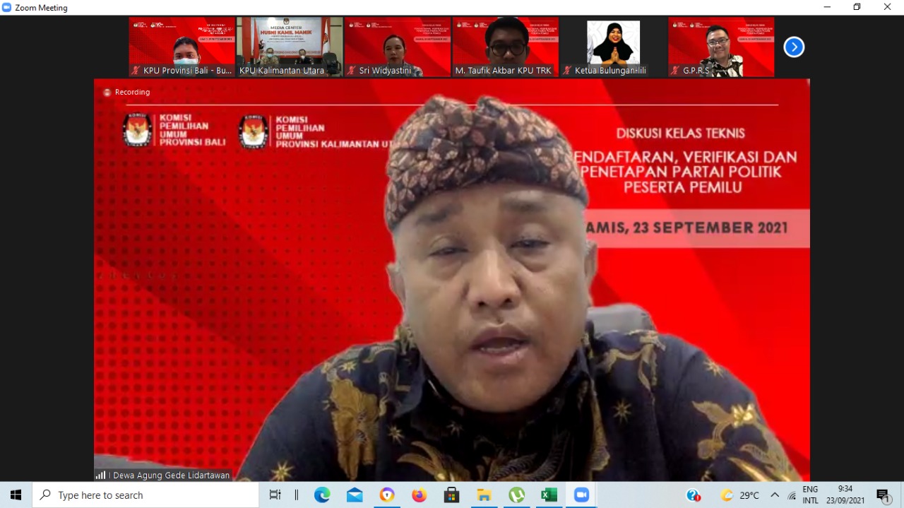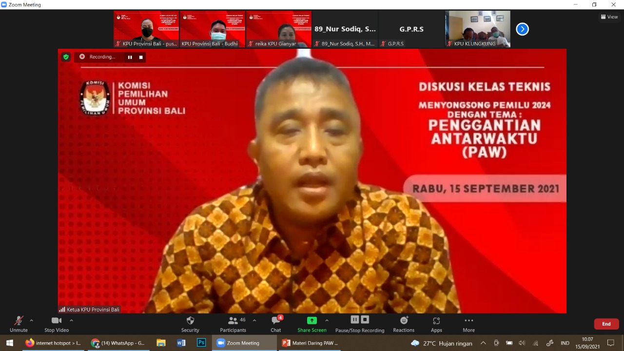 Mangupura, - Jelang pelaksanaan Pemilu dan Pemilihan Serentak Tahun 2024, KPU Kabupaten/Kota se Bali memantapkan pemahaman terkait dengan proses pelaksanaan Penggantian Antar Waktu (PAW) Anggota Dewan Perwakilan Rakyat Daerah. Hal ini dibahas dalam Diskusi Kelas Teknis: Menyongsong Pemilu 2024 dengan Tema Penggantian Antarwaktu (PAW) yang diselenggarakan secara daring oleh KPU Provinsi Bali, Rabu (15/09/2021).