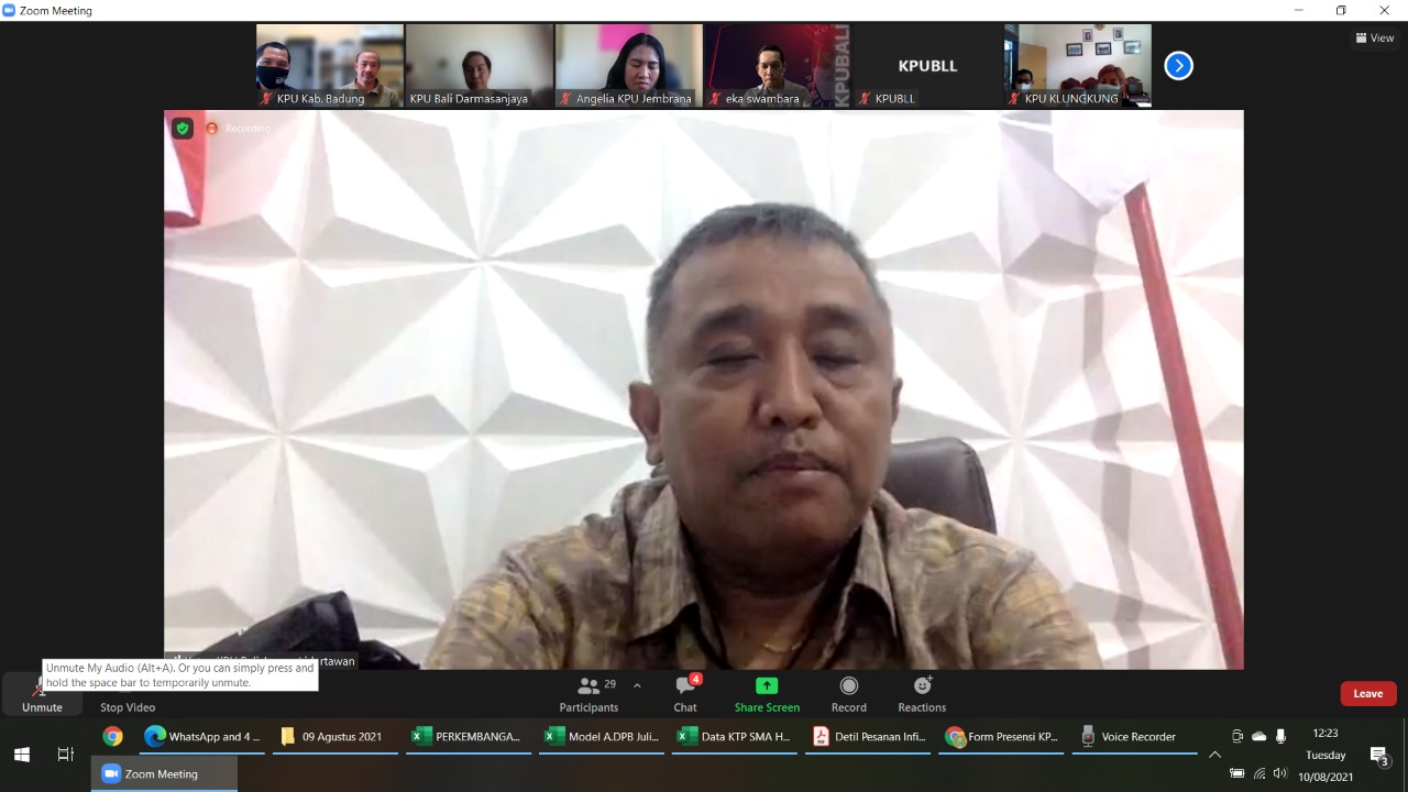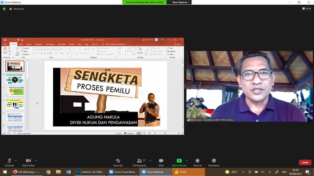 KPU Kabupaten Badung mengikuti Rapat Kerangka Hukum Sengketa Pemilu melalui daring yang dilaksanakan oleh KPU Provinsi Bali (Jumat, 6/08/2021). Kegiatan ini bertujuan dalam rangka menambah wawasan dan penguatan pemahanan terhadap sengketa pemilu. Plh. Ketua KPU Provinsi Bali, Luh Putu Sri Widyastini saat membuka kegiatan menyampaikan agar KPU Kabupaten/Kota se-Bali bisa mengikuti diskusi dengan baik sehingga mendapatkan hasil yang dapat diimplementasikan dikemudian hari. Kegiatan kali ini menghadirkan narasumber dari Anggota Divisi Hukum dan Pengawasan KPU Provinsi Bali, Anak Agung Gede Raka Nakula. Dalam materinya disampaikan, konsen KPU dalam mengantisipasi terjadinya sengketa proses. Beberapa tahapan diantaranya meliputi tahap verifikasi pendaftaran parpol baik verifikasi administratif ataupun verifikasi faktual, penetapan parpol peserta pemilu, penetapan Daftar Calon Sementara dan Daftar Calon Tetap peserta pemilihan anggota DPR, DPRD, dan DPD serta penetapan pasangan calon. Disampaikan juga terkait cara Penyelesaian Sengketa Proses melaui Mediasi dan Adjudikasi. Sesi diskusi bersama KPU Kab/Kota se-Bali, membahas mengenai beberapa pengalaman sengketa proses yang pernah dihadapi serta bagaimana cara kita mengantisipasi kegiatan serupa di tahapan pemilu dan pemilihan serentak tahun 2024. Kegiatan di tutup langsung oleh Anak Agung Gede Raka Nakula sekaligus menambahkan untuk kegiatan mendatang akan disampaikan terkait dengan materi Adjukasi. Foto Terkait :