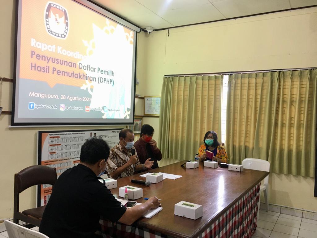 MANGUPURA. Guna memberikan informasi terkait perkembangan data pemilih, KPU Kabupaten Badung menggelar Rapat Koordinasi DPHP (Daftar Pemilih Hasil Pemuktahiran) pada, Jumat (28/08/2020). Kegiatan yang mengundang KPU Provinsi Bali, Dinas Kependudukan dan Pencatatan Sipil, Kepala Bidang Kesatuan Bangsa dan Politik, Bawaslu Kabupaten Badung, PPK dan Panwascam se-Kecamatan Badung tetap mengacu pada protokol kesehatan. Anggota KPU Kabupaten Badung Divisi Perencanaan, Data dan Informasi I GKG Yusa Arsana mengungkapkan terkait dengan hasil rekapitulasi coklit yang dilaksanakan dari tanggal 15 Juli s.d. 13 Agustus 2020, pihaknya telah berkoordinasi lebih awal dengan Bawaslu, Disdukcapil, Kesbangpol dan PPK. “Di Kabupaten Badung jumlah TPS menjadi 997, ada pengurangan sejumlah 72 TPS dari total TPS awal 1069,” bebernya saat memberikan keterangan bertempat di Rumah Pintar Pemilu. Lebih jauh, ia mengatakan untuk penggabungan misalnya pada TPS 1 dan 2 pemilihnya berjumlah hanya 200 pemilih dan jika ditotal menjadi 400 pemilih, maka akan digabungkan menjadi 1 TPS. Terkait dengan data A-KWK, pihaknya juga tidak memperbolehkan memberikan data apapun yang berkaitan dengan data pemilih karena adanya Undang-Undang mengenai perlindungan data diri. Anggota KPU Provinsi Bali I Gusti Ngurah Agus Darmasanjaya yang turut hadir dalam acara menerangkan untuk Pleno di desa dan kecamatan hanya memberikan hasil rekapan saja, melainkan penetapannya nanti akan di pleno kabupaten. “Untuk data A-KWK maupun A.B-KWK tidak bisa diberikan karena data pribadi seseorang merupakan data rahasia, tidak bisa diberikan ke sembarang orang. Jadi KPU tidak bisa memberikan ke pihak manapun,” tegasnya. Selanjutnya Sekretaris Dinas Kependudukan dan Pencatatan Sipil Putu Suryawati menuturkan, lembaganya sudah bersurat ke warga agar segera melakukan perekaman untuk anaknya yang kelahiran tahun 2003. Mengenai pengahapusan data, Disdukcapil juga tidak bisa sembarangan menghapus data warga karena ada sanksinya. Jadi harus ada surat keterangan/akta kematian bagi warga yang sudah meninggal. “Disdukcapil sudah melakukan perekaman untuk warga yang belum memiliki KTP-el. Untuk warga yang belum mendapatkan KTP-el karena kehabisan keping, akan di berikan surat keterangan yang nantinya bisa ditukarkan pada saat keping sudah tersedia,” tambahnya. Sementara itu, Anggota Bawaslu Kabupaten Badung Made Pande Yuliartha menuturkan terkait kepastian data hasil coklit PPDP yang diperlukan sebagai laporan dalam pengawasan. Saat ini untuk data kepengawasan hanya menggunakan data sample dari panwascam. “Ketika melaksanakan pengawasan kami keterbatasan data-data, jadi sangat dibutuhkan data-data pasti dari hasil coklit. Contoh TMS dengan total 72.805 tersebut dikarenakan apa saja bisa TMS, yang seperti itu kami perlukan,” terangnya. Ia juga menambahkan Bawaslu ataupun panwascam hanya mengawasi proses dari awal data sampai DPT, oleh karena itu memerlukan data-data hingga hasil coklit. Dari daftar pemilih A-KWK yang semula 402.995 setelah di lakukan coklit terdapat adanya TMS 72.805, pemilih baru 33.405, pindah TPS 25.135, perbaikan data pemilih 5.341, perbaikan jenis kelamin 17. Setelah dilakukan pencermatan Daftar Pemilih Hasil Pemutakhiran berjumlah 363.595 orang yang memiliki hak suara dalam Pemilihan Bupati dan Wakil Bupati Badung tahun 2020. Foto terkait :