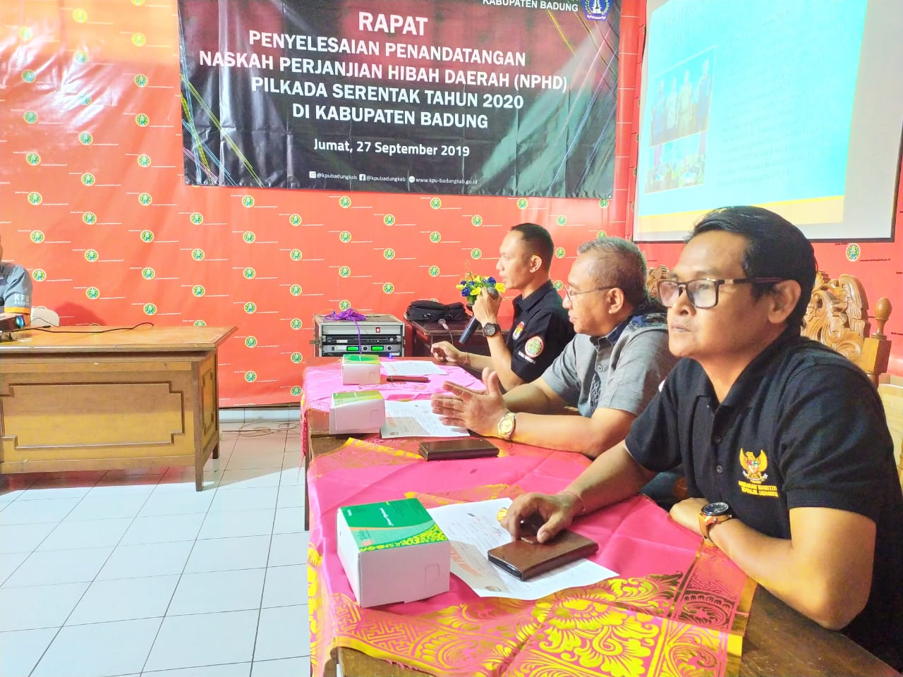 Mangupura - Pelaksanaan Pemilihan Kepala Daerah Serentak yang akan diselenggarakan tanggal 23 September 2019 mendatang telah memasuki babak baru di Badung. Terlebih dengan telah ditandatanganinya Naskah Perjanjian Hibah Daerah (NPHD) pelaksanaan Pemilihan Bupati dan Wakil Bupati Badung Tahun 2020 antara Komisi Pemilihan Umum (KPU) Kabupaten Badung dengan Pemerintah Daerah Kabupaten Badung hari ini, di Gedung Wiswasabha Denpasar, Selasa (1/10/2019). Kegiatan Penandatanganan NPHD Hibah Pilkada ini dilaksanakan bersamaan dengan Kabupaten/Kota di Provinsi Bali yang akan melaksanakan Pilkada Serentak tahun 2020 yaitu Kota Denpasar, Kabupaten Tabanan, Jembrana, Bangli dan Karangasem. FOTO TERKAIT : Menjadi catatan penting karena Provinsi Bali merupakan satu-satunya provinsi yang memfasilitasi Pemerintah Kabupaten/Kotanya yang akan melaksanakan Pilkada Serentak melalui pelaksanaan Penandatangan NPHD Hibah Pilkada secara serentak. Ketua KPU Kabupaten Badung, I Wayan Semara Cipta usai acara penandatanganan NPHD Hibah Pilkada Badung ini menyambut baik kegiatan yang dilaksanakan serentak dan difasilitasi oleh Pemerintah Daerah Provinsi Bali. Hal ini penting terlebih dalam Peraturan KPU (PKPU) Nomor 15 tahun 2019 tentang Jadwal, Tahapan dan Program Penyelenggaraan Pilkada Serentak tahun 2020 telah secara jelas mengatur bahwa penandatanganan NPHD paling lambat dilaksanakan tanggal 1 Oktober 2019. Selanjutnya Kayun Semara sapaan akrab I Wayan Semara Cipta ini menyampaikan ucapan terima kasih atas dukungan penuh dari Pemerintah Daerah Kabupaten Badung melalui Bupati dan Wakil Bupati serta Ketua DPRD yang telah menyetujui anggaran pelaksanaan Pilkada Badung tahun 2020 mendatang sebesar 29,2 Milyar serta kepada Sekretaris Daerah Kabupaten Badung, dan seluruh jajaran Organisasi Perangkat Daerah (OPD) terkait yang telah membantu segala proses administrasi sehingga penandatanganan NPHD Hibah Pilkada Badung Tahun 2020 dapat terlaksana tepat waktu. Dengan telah ditandatanganinya NPHD ini, maka segala Tahapan Pemilihan Bupati dan Wakil Bupati Badung akan segera dimulai. KPU Kabupaten Badung berharap dalam pelaksanaannya nanti, tanggal 23 September 2020, tingkat partisipasi pemilih dengan kehadiran pemilih untuk menggunakan hak pilihnya ke TPS dapat meningkat lebih baik dari pemilu-pemilu sebelumnya.