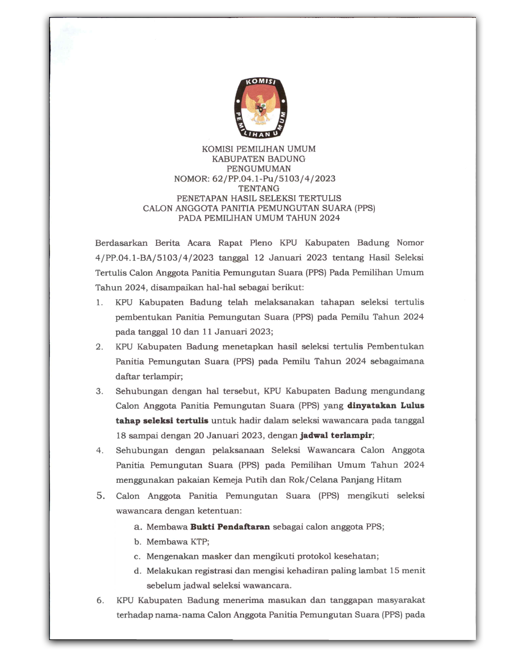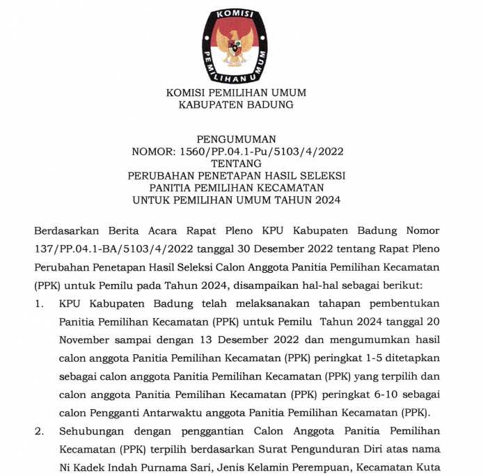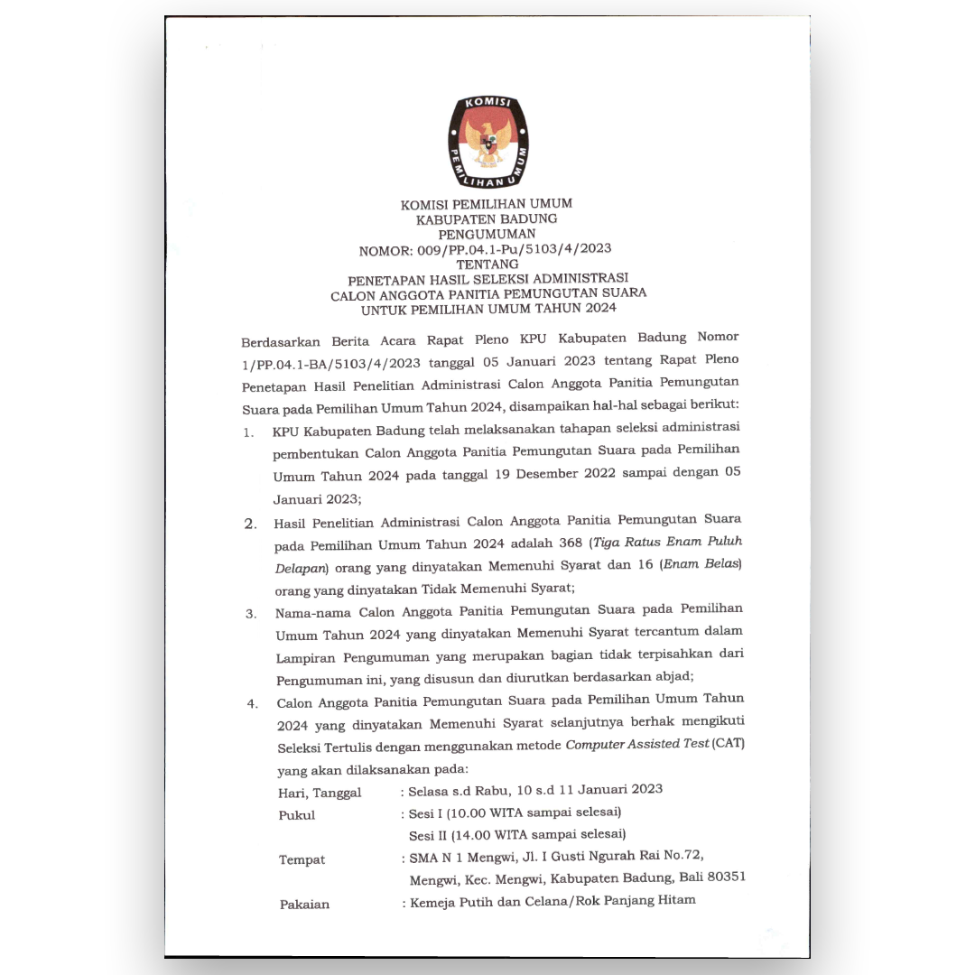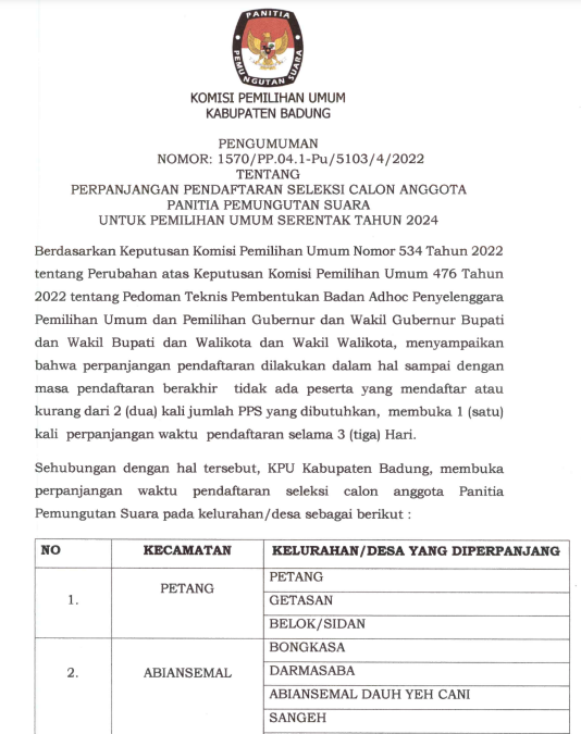 Komisi Pemilihan Umum (KPU) Kabupaten Badung menyampaikan Pengumuman Nomor 1570/PP.04.1-Pu/5103/4/2022 tentang Perpanjangan Pendaftaran Seleksi Calon Anggota Panitia Pemungutan Suara (PPS) untuk Pemilihan Umum tahun 2024 di Kabupaten Badung. Masa perpanjangan dilaksanakan mulai tanggal 31 Desember 2022 - 2 Januari 2023, pukul 08.00 - 16.00 Wita. Baca Berita Selengkapnya DISINI.