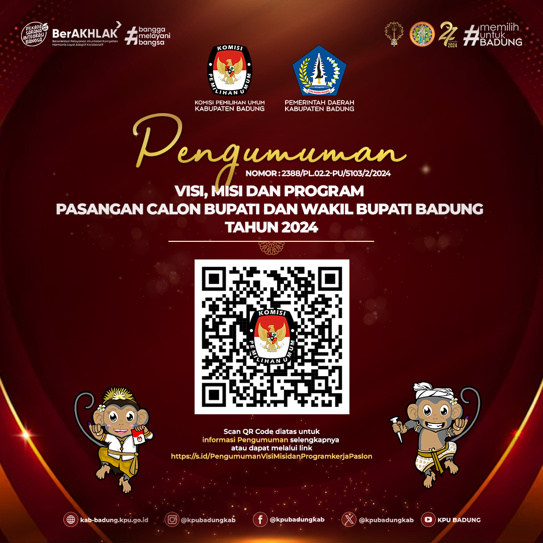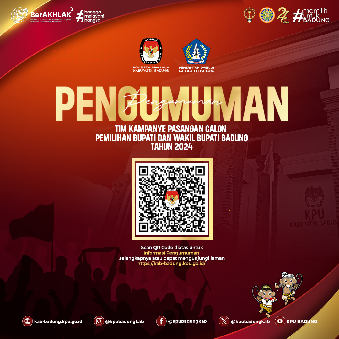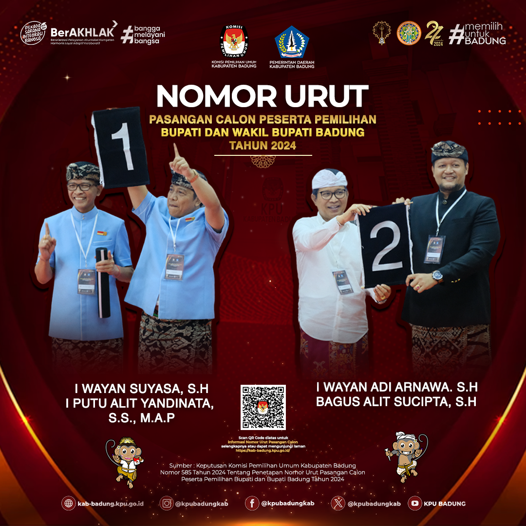 Informasi selengkapnya mengenai Nomor Urut Pasangan Calon dapat melalui Scan Barcode atau dapat melalui link berikut Nomor Urut Pasangan Calon Bupati dan Wakil Bupati Badung Tahun 2024