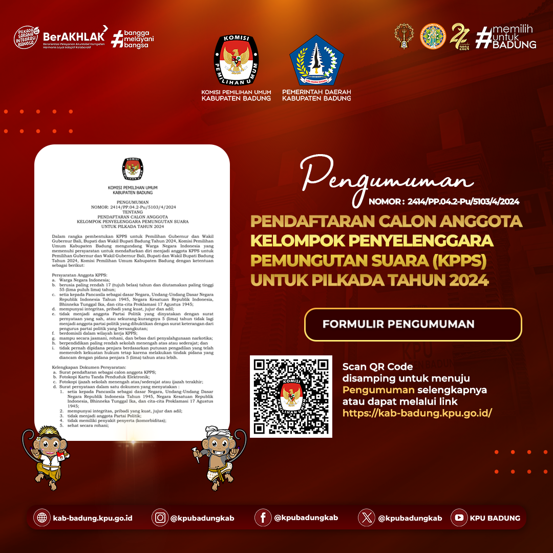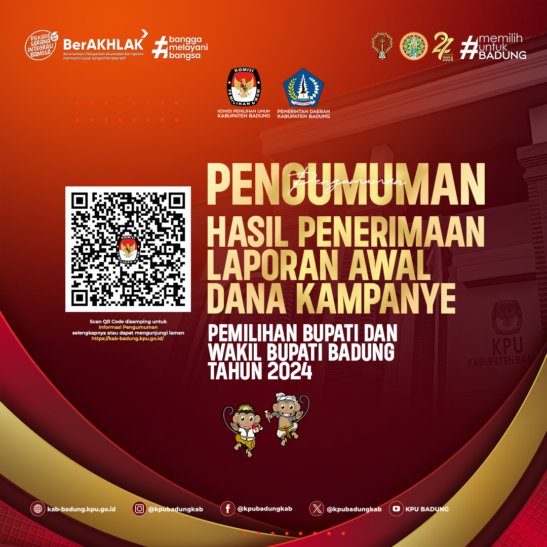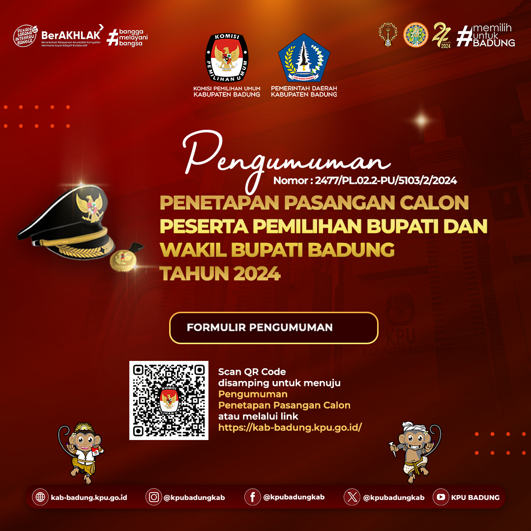 Informasi selengkapnya mengenai Nomor Urut Pasangan Calon dapat melalui Scan Barcode atau dapat melalui link berikut Nomor Urut Pasangan Calon Bupati dan Wakil Bupati Badung Tahun 2024