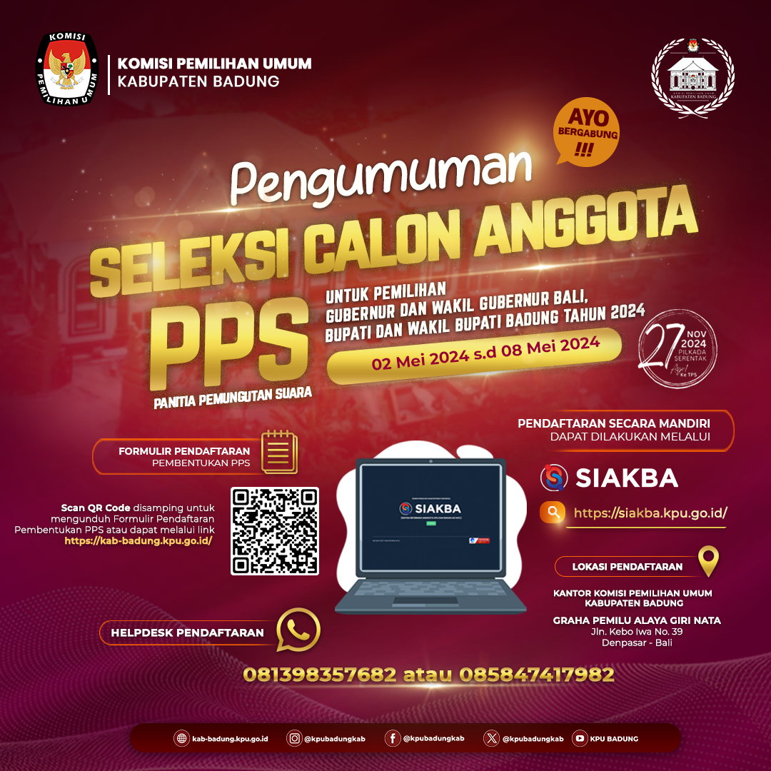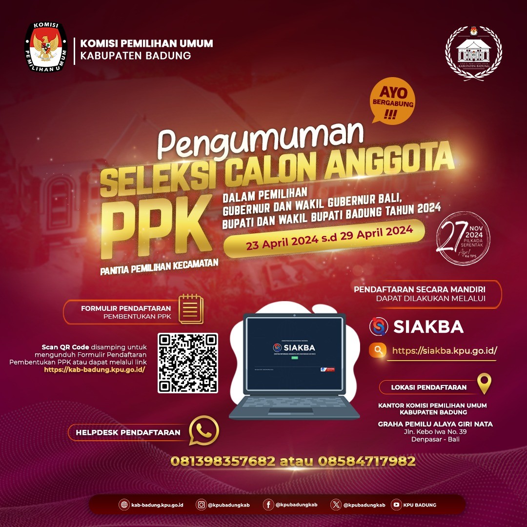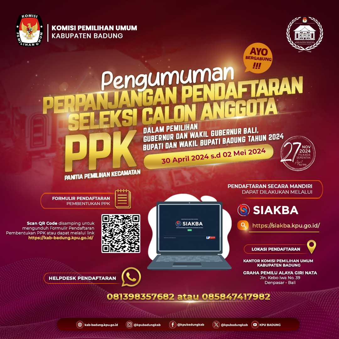 Sehubungan dengan hal tersebut, KPU Kabupaten Badung, membuka perpanjangan waktu pendaftaran seleksi calon anggota PPK sejak tanggal 30 April 2024 sampai dengan tanggal 02 Mei 2024 pada kecamatan sebagai berikut :
